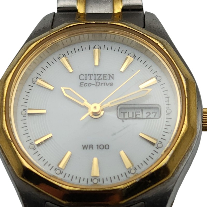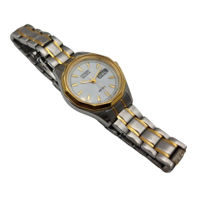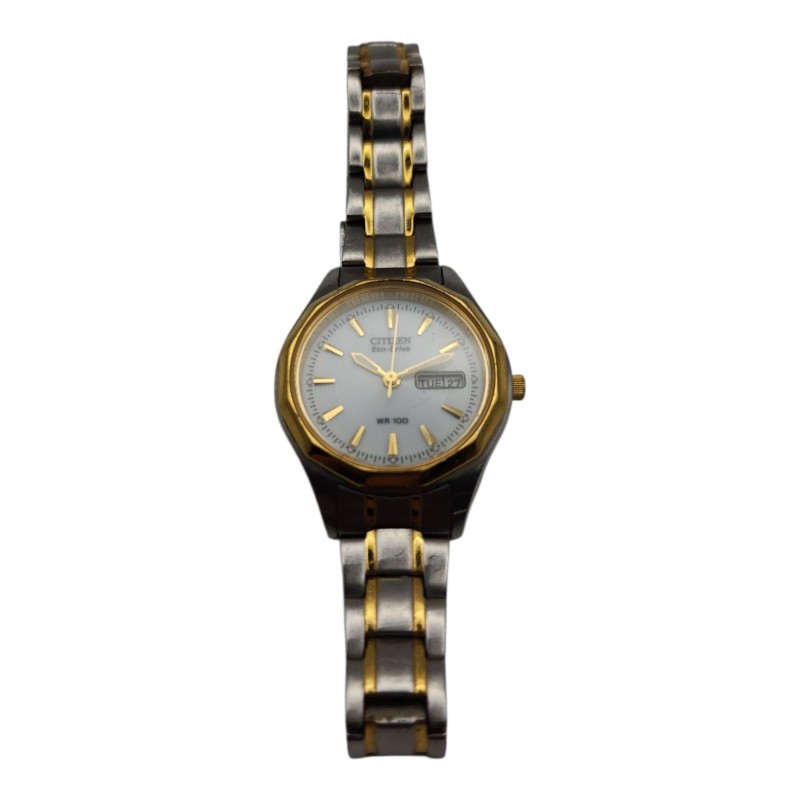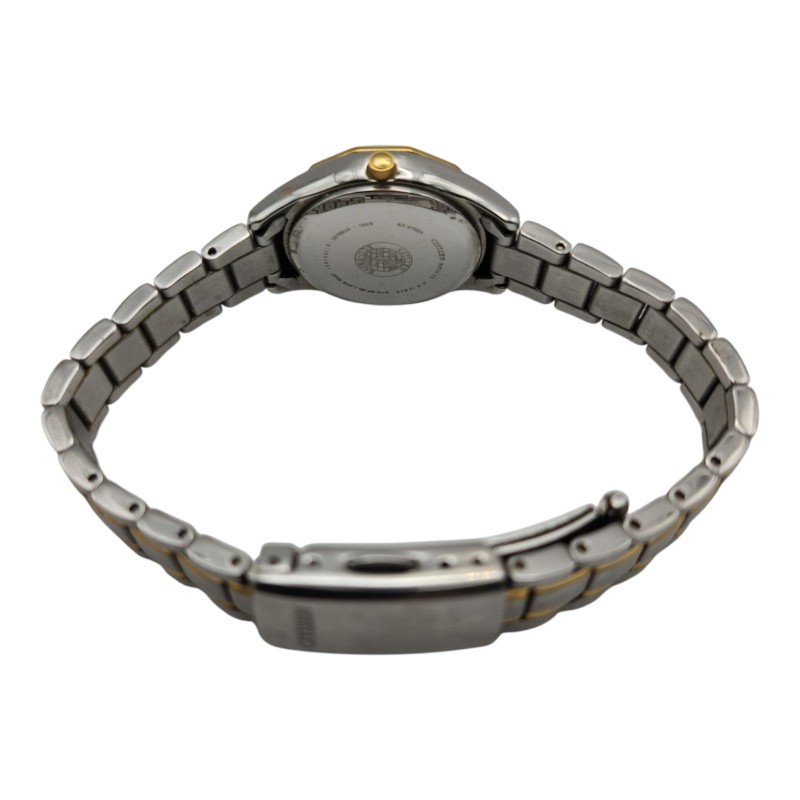 This stylish CITIZEN ladies' watch features a sleek silver stainless steel band and a crisp white face with a classic circular design. The face display showcases clean lines, providing a sophisticated and minimalist look. Suitable for everyday wear, this timepiece is a practical and fashionable accessory.