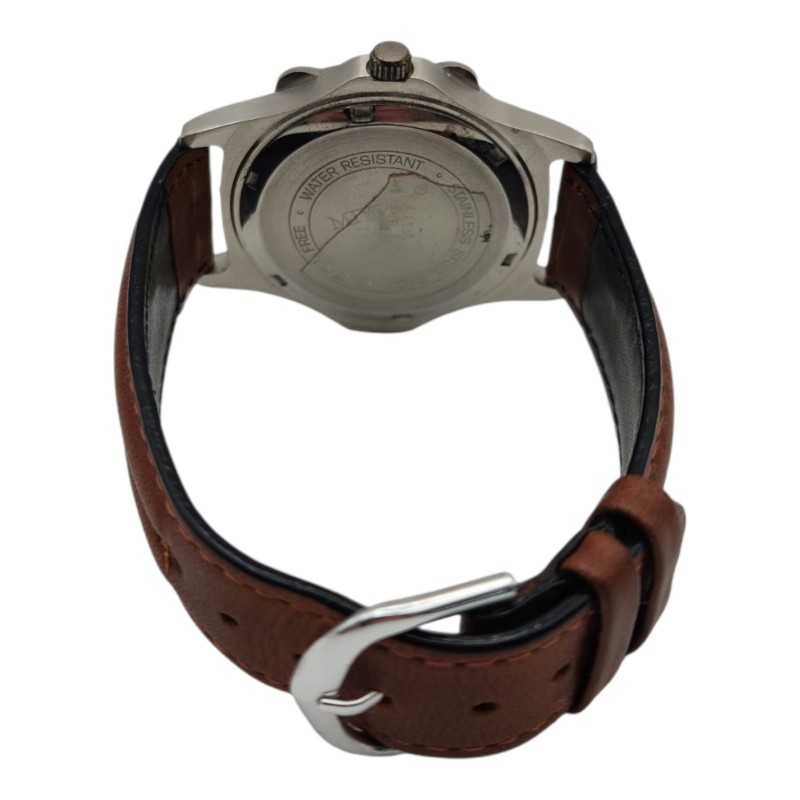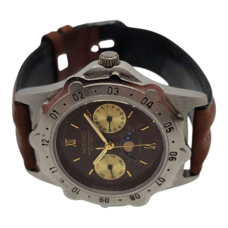 This vintage Miyoko Quartz chronograph watch features a classic circular face with Roman numerals and lines against a warm brown backdrop. The high-quality leather band in a complementary brown shade adds a touch of timeless sophistication. With a weight of 50.33 grams, this men's timepiece offers a substantial yet comfortable wear. Its reliable quartz movement ensures accurate timekeeping, making it a practical and stylish accessory for the modern gentleman.