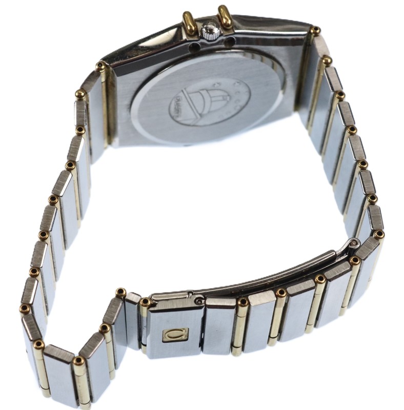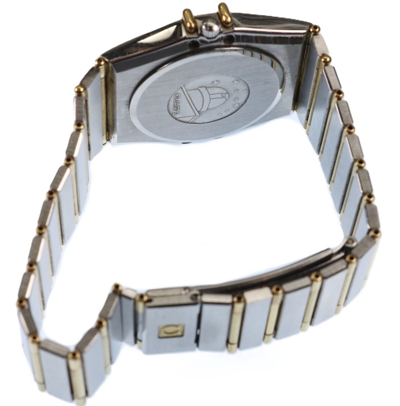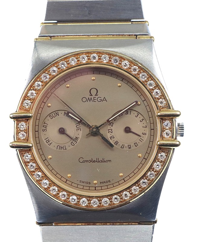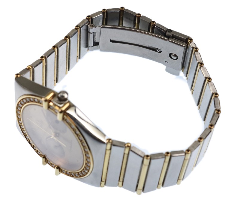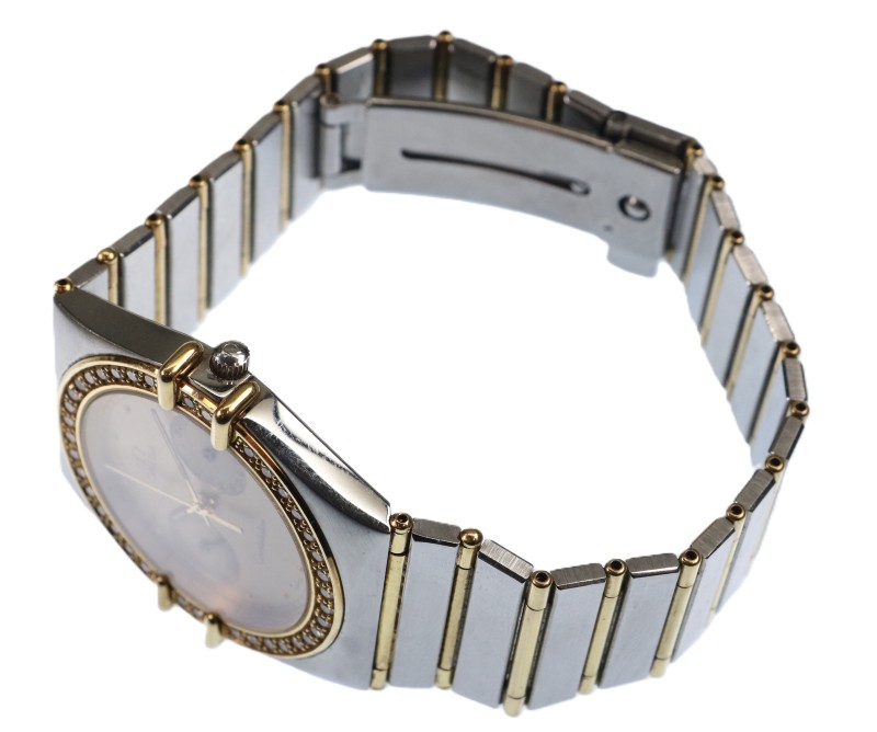 This elegant OMEGA CONSTELLATION ladies' dress watch features a classic circular face with a stunning gold tone and timeless Roman numeral display. The high-quality metal case and band in a sleek silver finish create a sophisticated, timeless look. The 38 sparkling diamond accents add a touch of luxury, while the included warranty card, extra link, pillow, and original box provide added value and peace of mind.