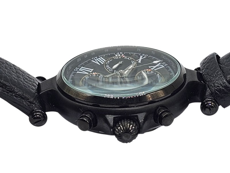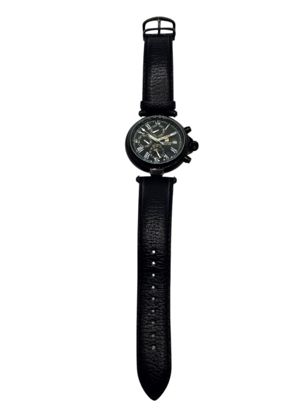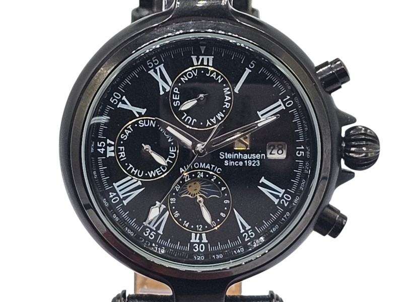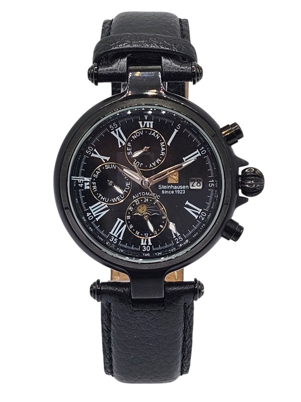 This elegant STEINHAUSEN dress watch features a classic circular face with Roman numeral markers set against a sleek black metal surface. The black leather band provides a sophisticated and timeless look, while the stainless steel case offers durability and a water resistance of 5ATM. With 21 jewels and a Swiss design, this unisex timepiece combines quality craftsmanship with a timeless aesthetic, making it a versatile accessory suitable for both formal and casual occasions.