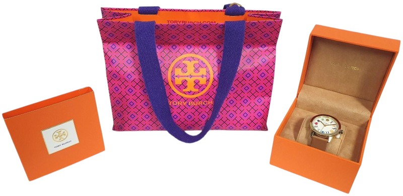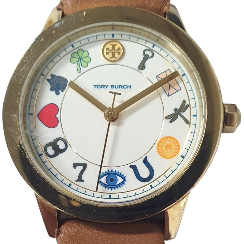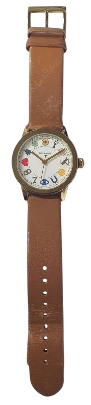 This Tory Burch TBW2014 watch features a classic circular face with a white display showcasing numbers. The beige leather band complements the plastic face material, creating a timeless and versatile look suitable for any occasion. Whether you're dressing up or down, this unisex timepiece will seamlessly integrate into your style.