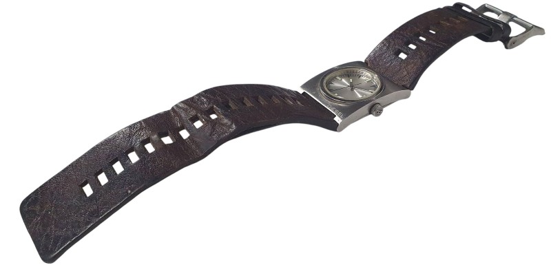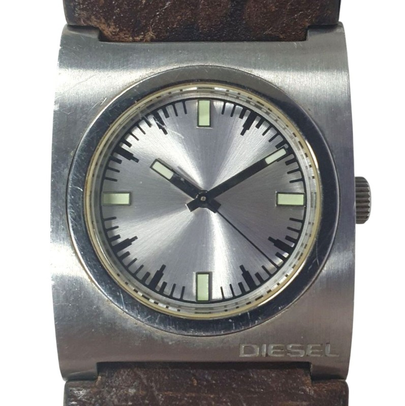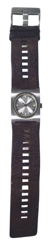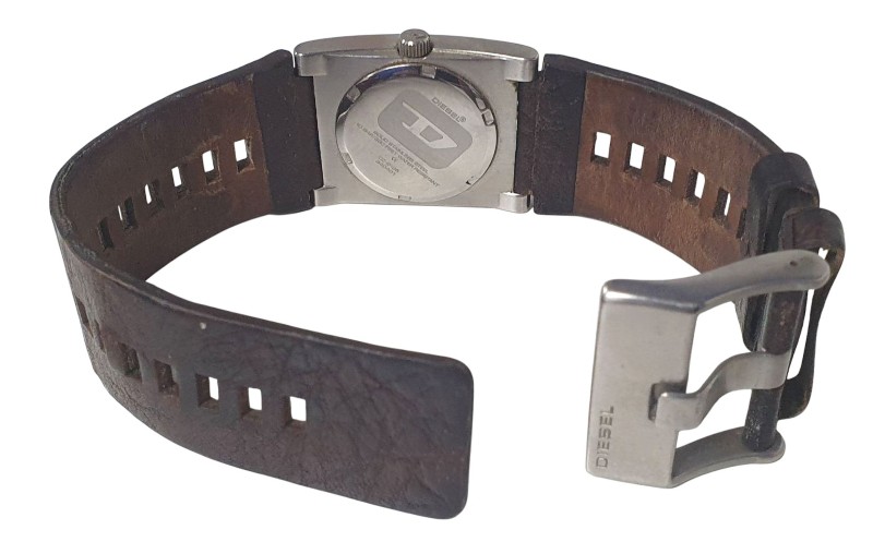 This DIESEL DZ-2105 dress watch features a square metal face with classic Roman numeral display set against a crisp white backdrop. The unisex design is complemented by a durable brown leather band, making it a timeless accessory suitable for both casual and formal occasions. With a weight of 59.4 grams, this watch offers a substantial yet comfortable feel on the wrist.