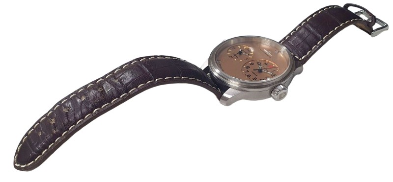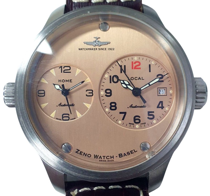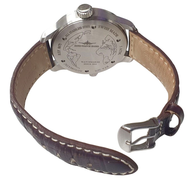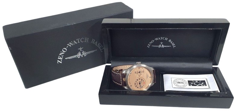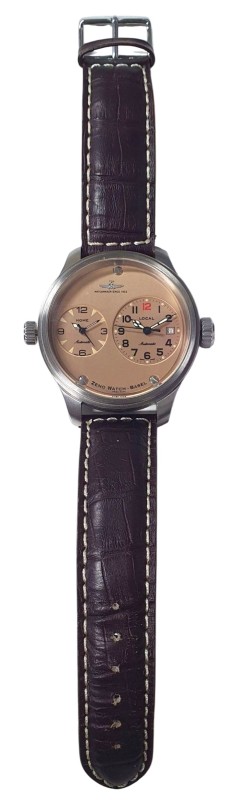 This vintage Zeno-Watch Basel is a classic dress watch that exudes timeless sophistication. Crafted with a brown leather band and a circular metal face in a complementary brown hue, this timepiece features a straightforward numerical display that provides clear and easy-to-read time-telling. The robust construction and attention to detail make this a reliable and stylish accessory for the modern gentleman.