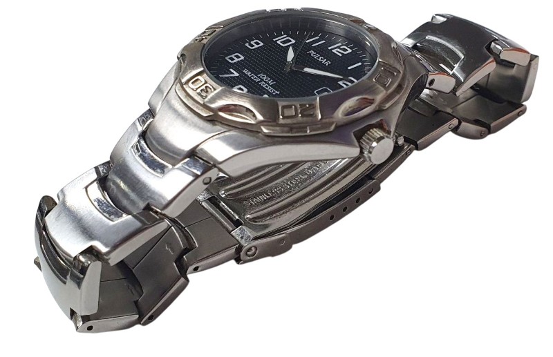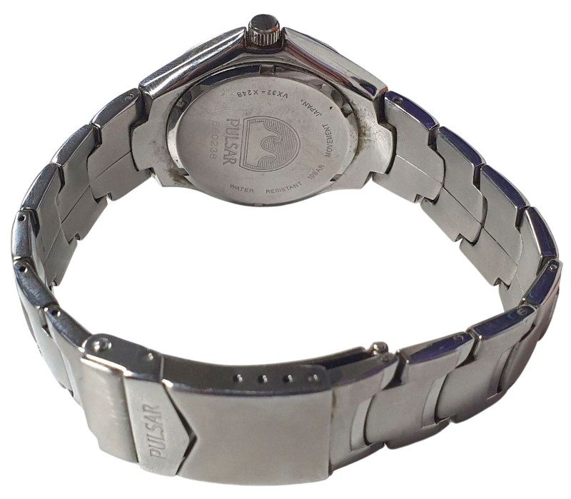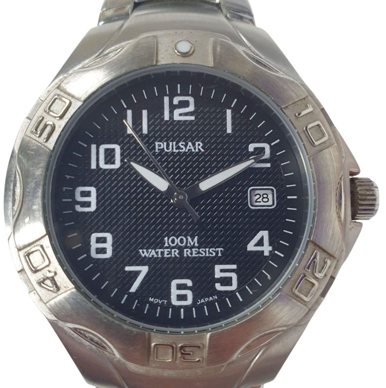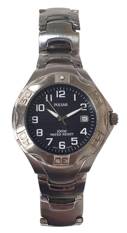 This PULSAR watch features a sleek and durable silver metal band that complements the black metal face. The circular face displays the time clearly with bold numerical markings, ensuring easy readability. With a water resistance rating of 100M, this watch is suitable for everyday wear and light water activities. Crafted with high-quality materials, this timepiece offers a classic and sophisticated look that will seamlessly integrate into any wardrobe.