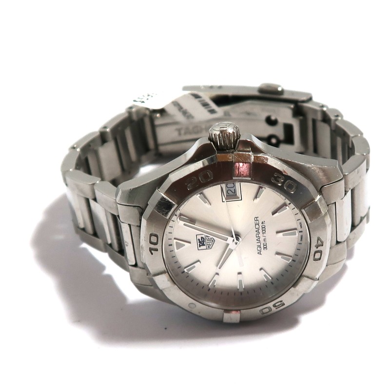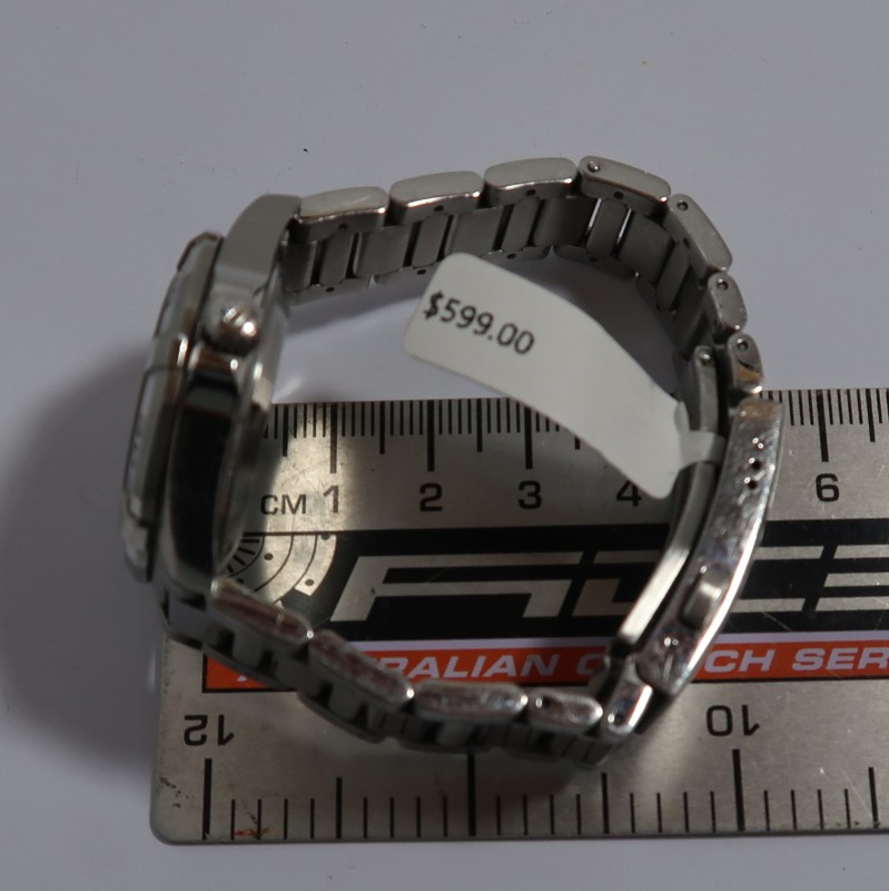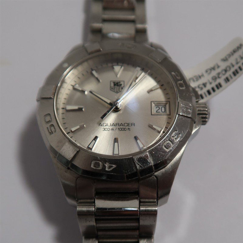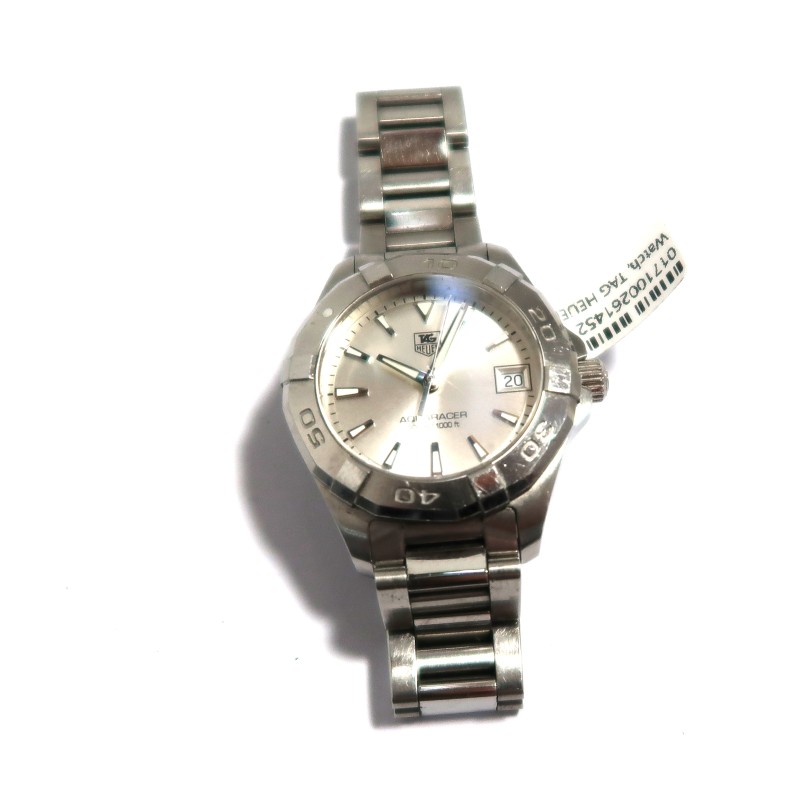 This elegant ladies' TAG HEUER dress watch features a sleek silver-tone stainless steel case and bracelet. The minimalist dial with stick hour markers and a date display window creates a sophisticated, timeless look. Powered by a reliable quartz movement, this pre-owned timepiece will keep you punctual throughout the day. Its classic design makes it suitable for both casual and formal occasions.