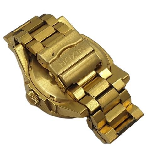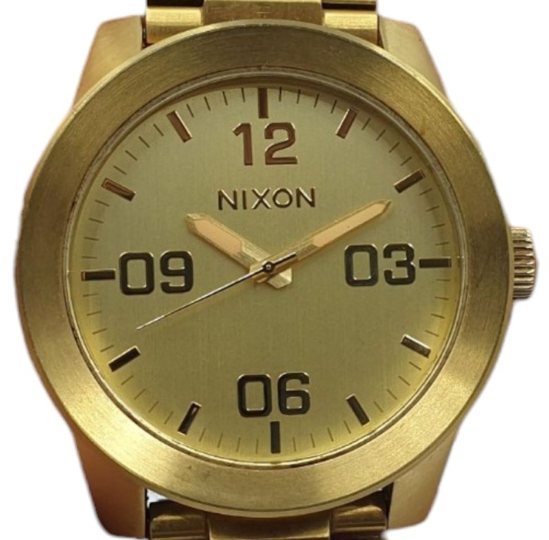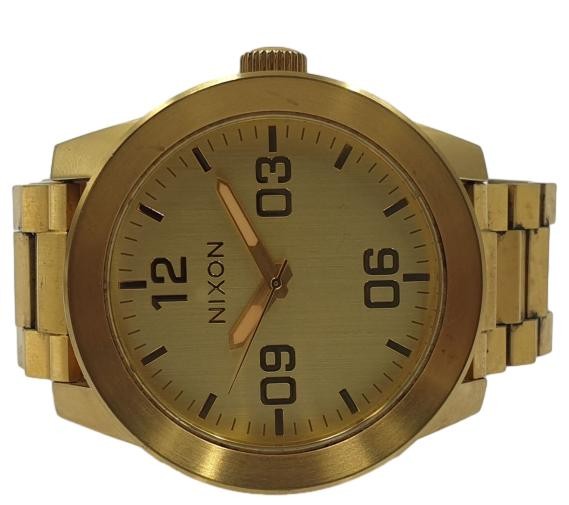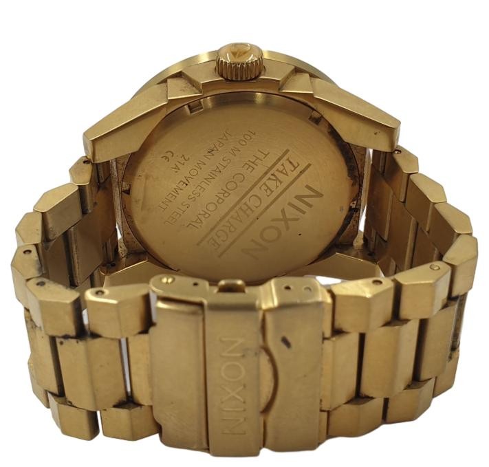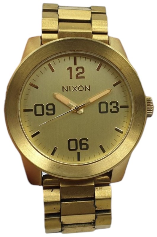 This Nixon Take Charge dress watch features a stylish gold-toned metal band and a circular glass face with prominent numerals. The classic design and robust construction make it a versatile timepiece suitable for both formal and casual occasions. The gold-coloured face adds a touch of elegance, while the metal band provides a comfortable and durable fit. Whether you're dressing up or keeping it casual, this watch is a reliable and sophisticated accessory.