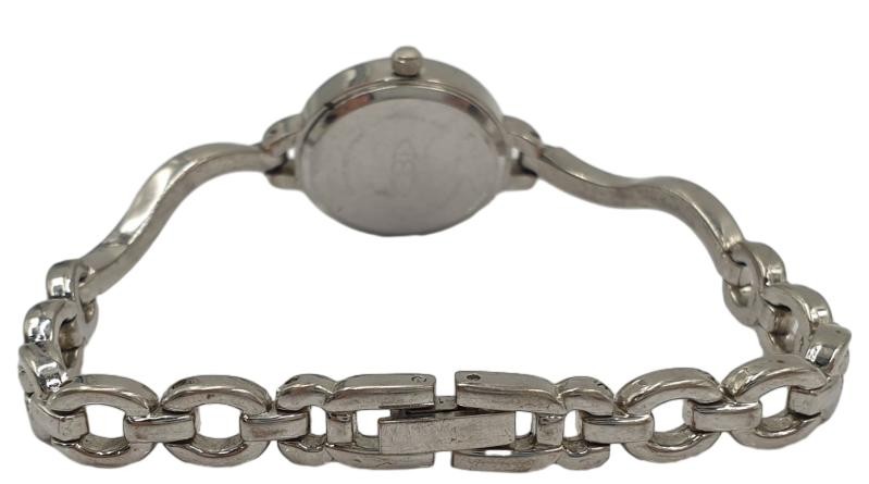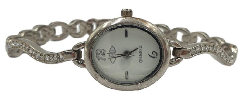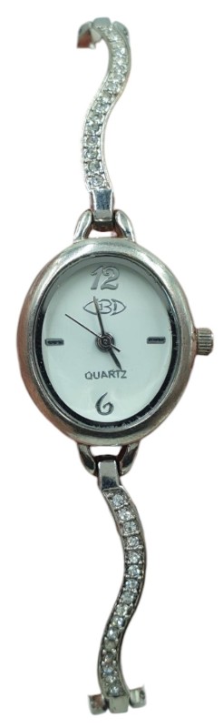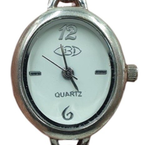 This elegant ladies' dress watch from CBD features a sleek silver metal band and a classic white metal face with a timeless oval shape. The face displays the hours and minutes in a simple yet sophisticated numeric layout, making it a versatile accessory suitable for both casual and formal attire. With its durable metal construction, this pre-owned timepiece is built to withstand everyday wear and provide reliable timekeeping.