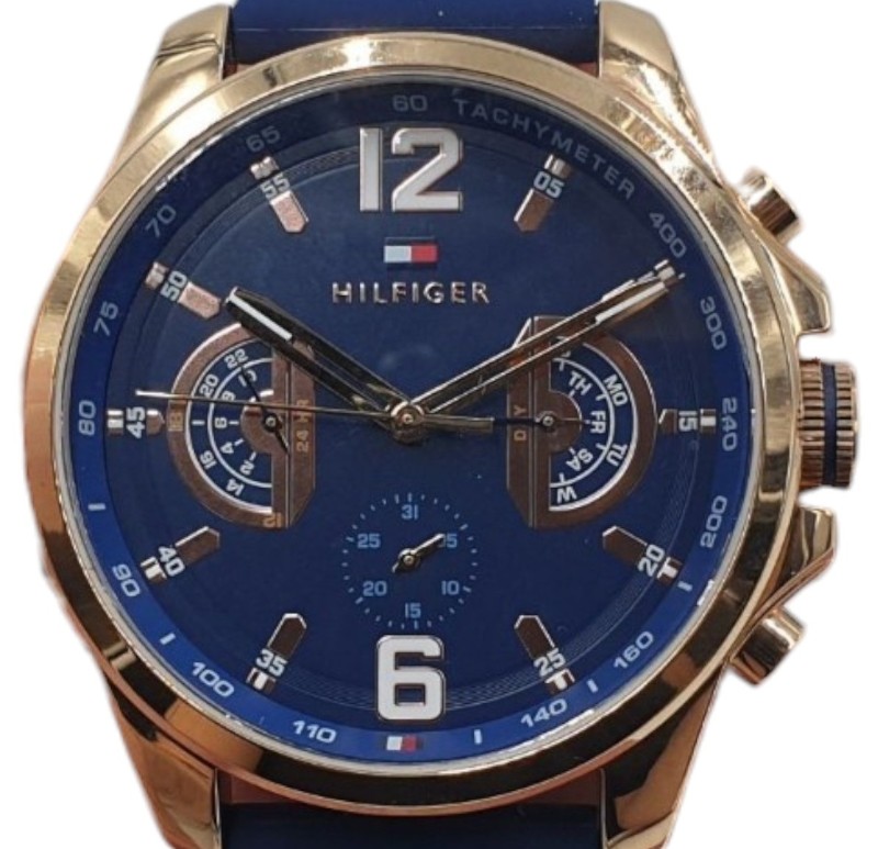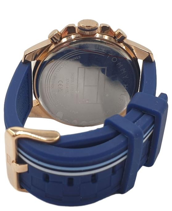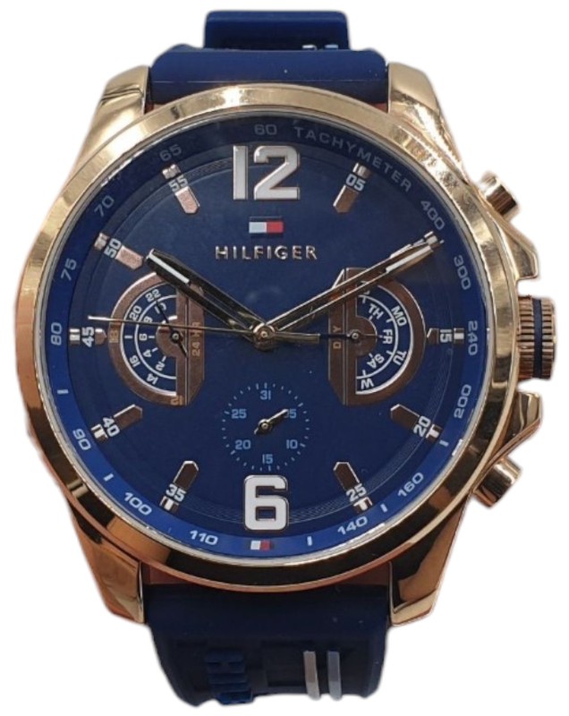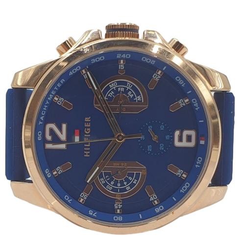 This classic TOMMY HILFIGER TH.511.1.112.3700 dress watch features a sleek blue plastic band and a circular glass face with a bold blue numeric display. The simple yet sophisticated design makes it a versatile accessory for any occasion. With its durable construction and timeless style, this pre-owned watch is a practical and stylish choice for the modern man.
