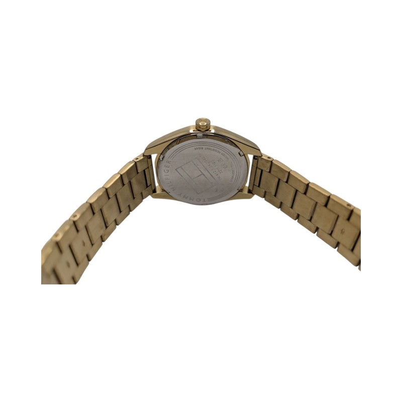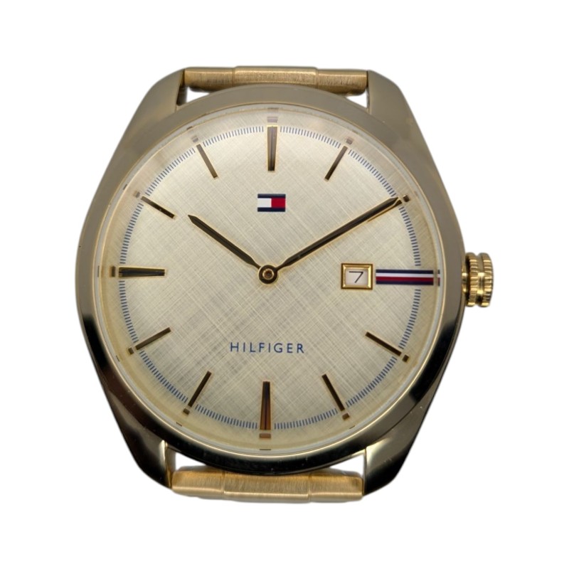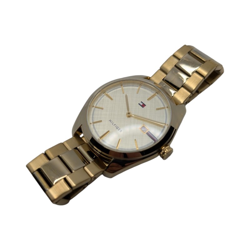 This Tommy Hilfiger dress watch features a sleek and sophisticated design with a gold metal band and a silver metal face. The circular face displays the time using dot markers, creating a classic and minimalist aesthetic. Suitable for both men and women, this timepiece is a versatile accessory that can be dressed up or down to suit any occasion.