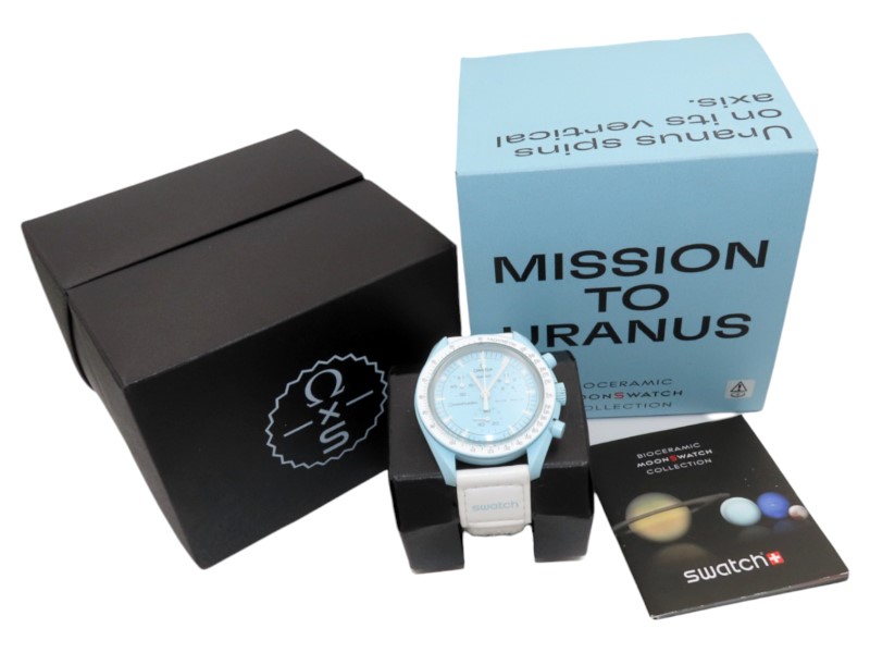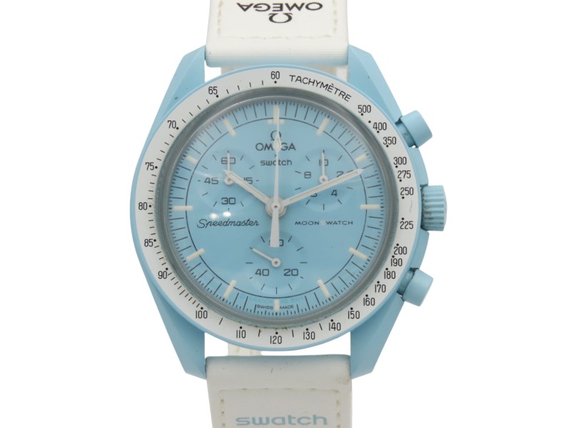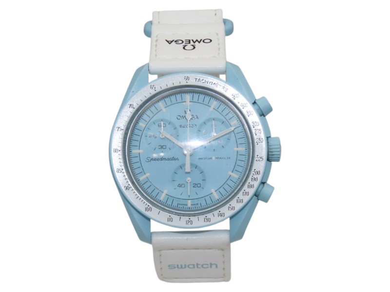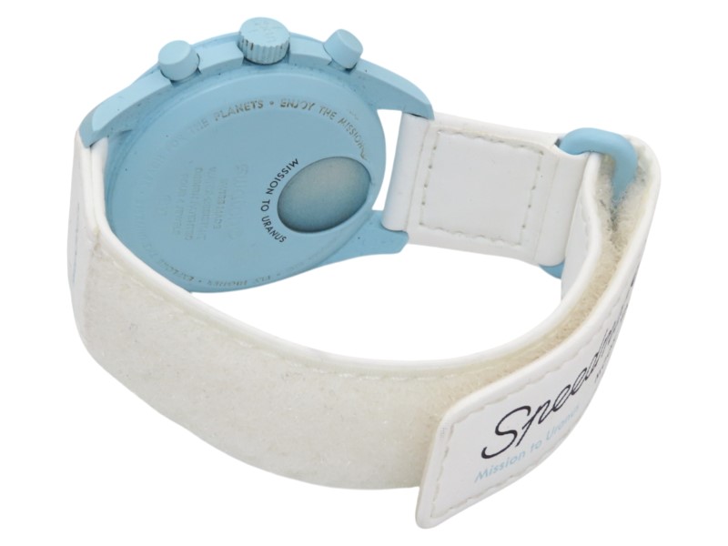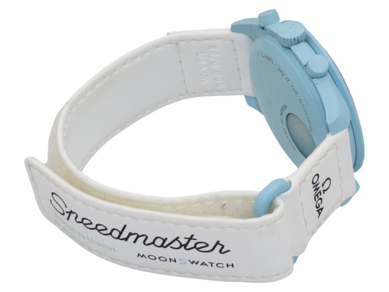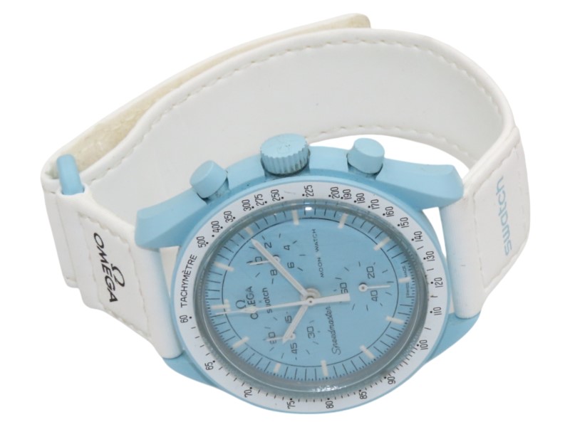 Pastel blue meets a bright white velcro strap on this non-limited model. All the hands are in white. A black tachymeter scale adorns a white-coloured bezel. All dials in the collection carry the OMEGA X Swatch branding, the iconic Speedmaster logo and the MoonSwatch logo. The biosourced glass construction, the etched "S" integrated in the centre of the glass, the fine and sophisticated circular pattern on the dial outer ring and the recessed sub dials, the angular and smooth lugs construction, the iconic “dot over 90” detail on the tachymeter scale, and of course the unique Bioceramic feel are common to all models. The hour, minute, and chronograph seconds hands as well as the hour markers sport Super-LumiNova for a perfect glow in the dark.