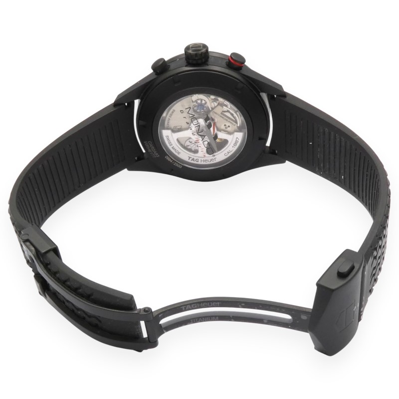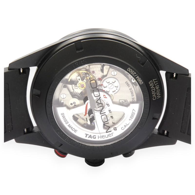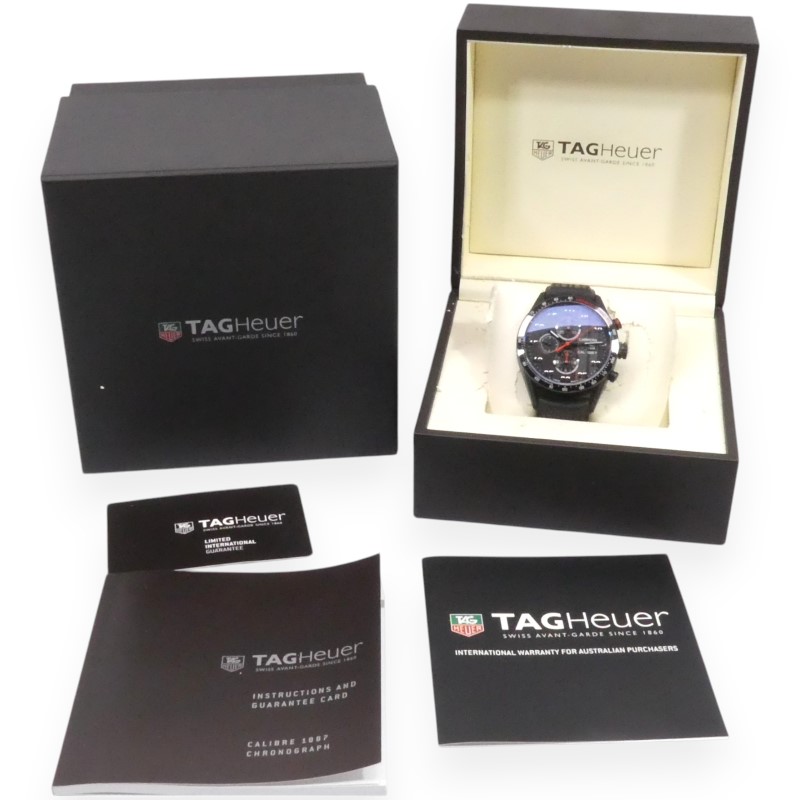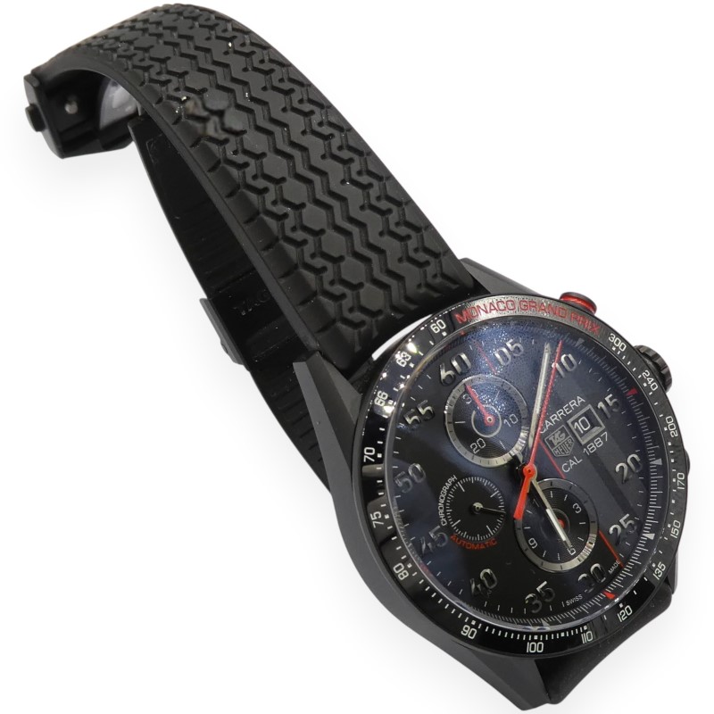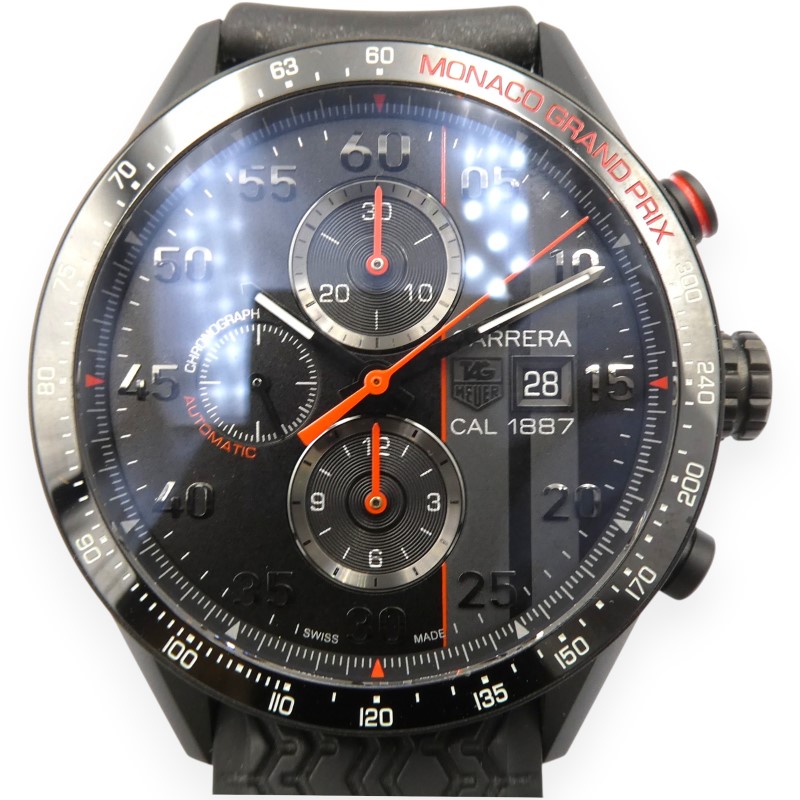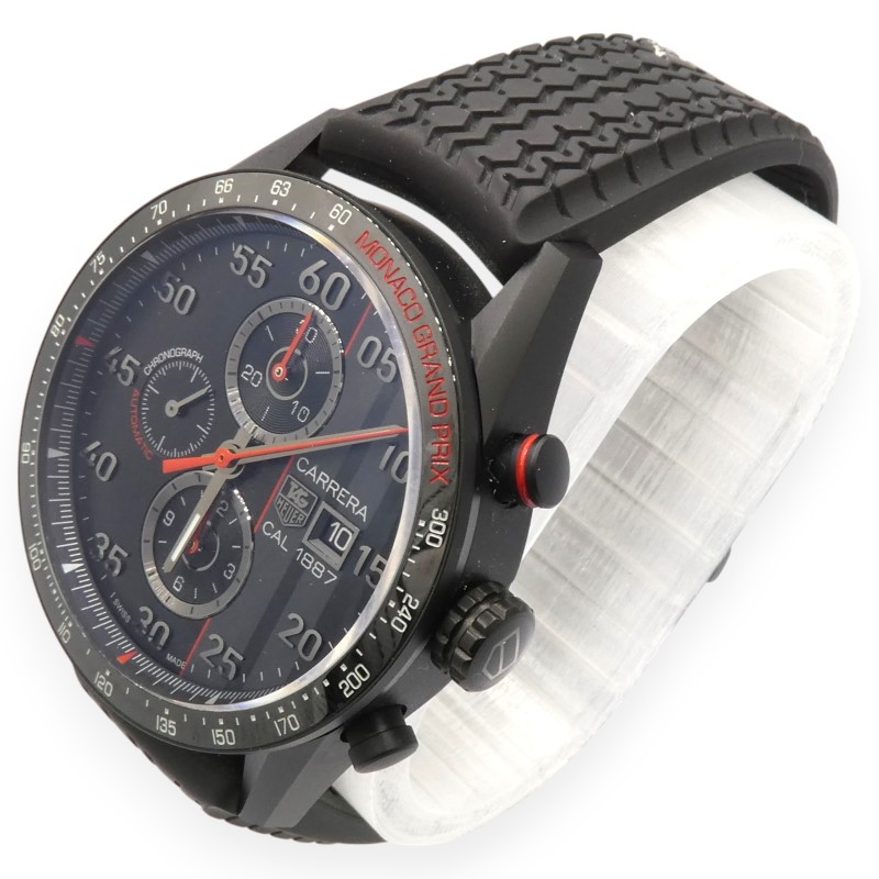 This stunning TAG HEUER Carrera Calibre 1887 Monaco Grand Prix Special Edition watch boasts a striking design that commands attention. The black ceramic face features a bold red racing stripe and red accents, complemented by a black titanium carbide case measuring 43mm in diameter. The chronograph sub-dial adds a touch of functionality to this stylish dress watch.