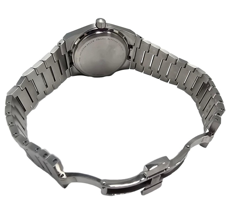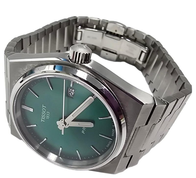 This stunning TISSOT PRX QUARTZ GREEN WATCH is a timepiece that exudes elegance and sophistication. Crafted with a silver metal band and a circular silver face, this watch features a classic numeric display that is both easy to read and visually appealing. The silver face material complements the overall design, creating a harmonious and refined aesthetic.