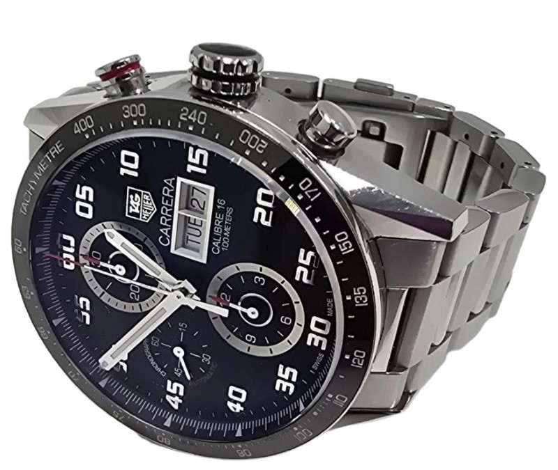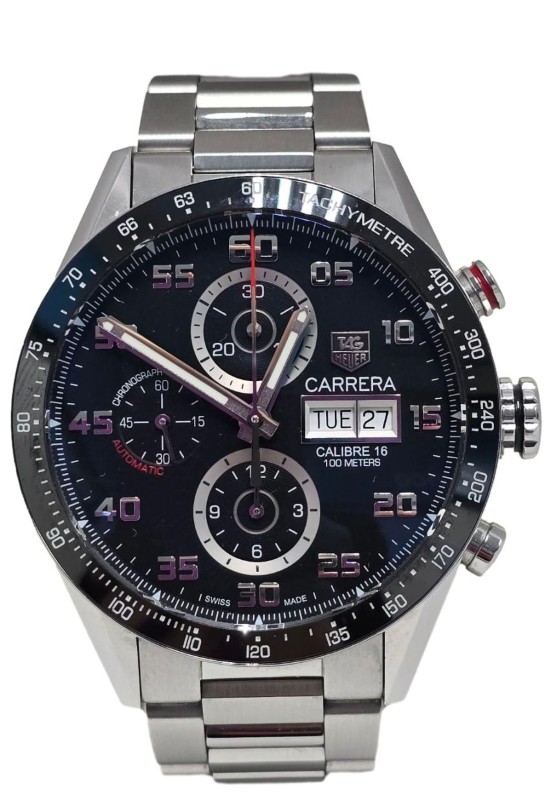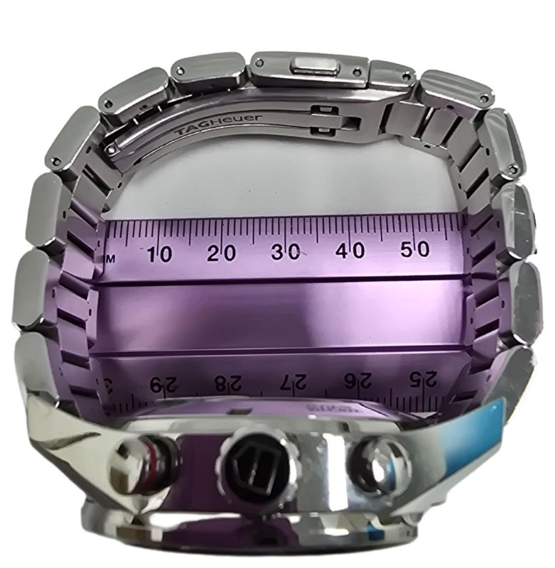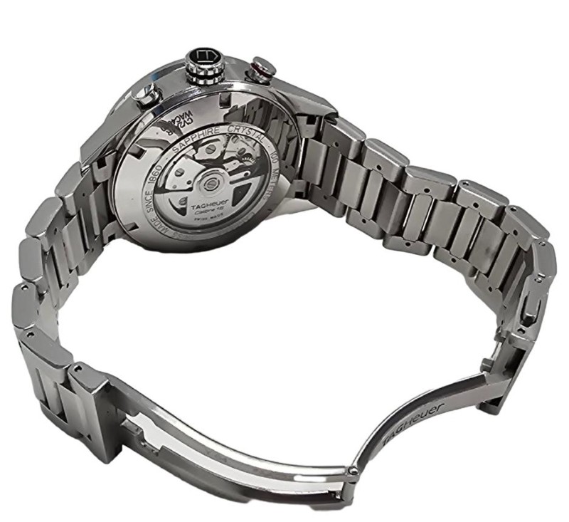 This pre-owned TAG Heuer CV2A1R Chronograph watch features a sleek silver stainless steel band and a striking black dial with Arabic numerals. The durable sapphire crystal face provides excellent scratch resistance, ensuring the watch maintains its premium appearance. Designed for the modern gentleman, this chronograph timepiece offers precise timekeeping functionality in a classic round case.
