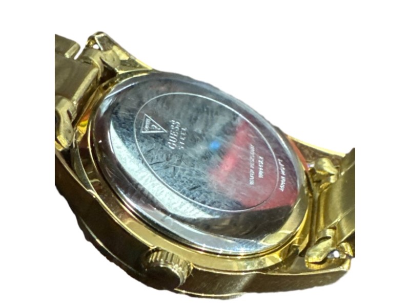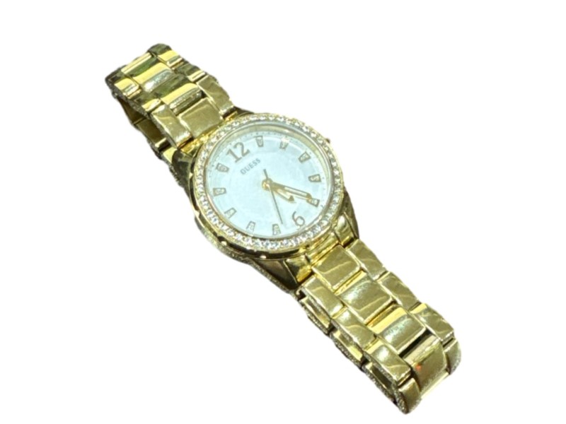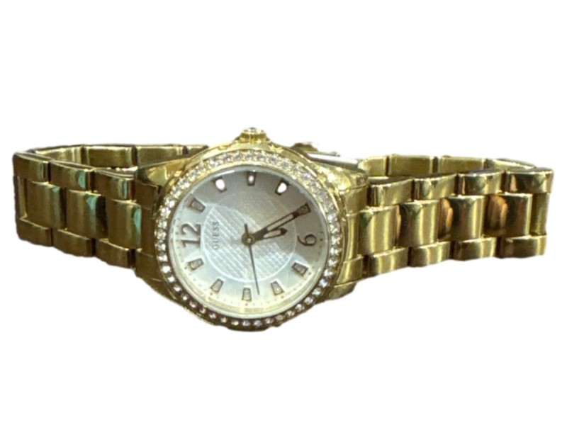 This GUESS w0445l2 ladies' dress watch features a classic circular face with a white display showcasing bold black numbers. The sleek gold-tone metal band complements the elegant design, making this a versatile accessory suitable for any occasion. The glass face material ensures durability and clarity, while the overall circular shape provides a timeless, sophisticated look. Whether dressing up or down, this secondhand GUESS watch is a reliable and stylish choice.