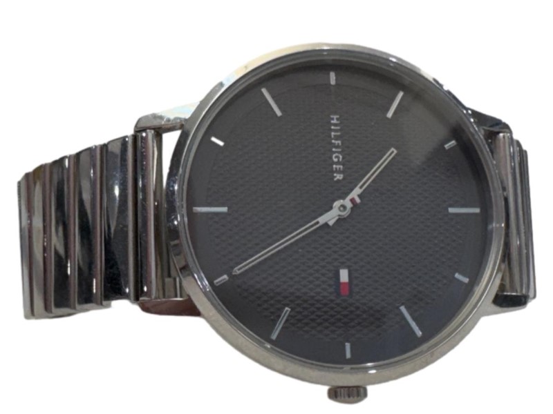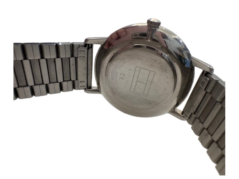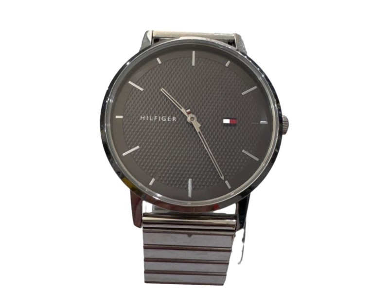 This pre-owned Tommy Hilfiger watch features a silver metal band and a grey glass face with a classic circular display. The watch face showcases bold numerical markings, making it a sophisticated choice for any formal or casual occasion. With its durable construction and timeless design, this dress watch is a reliable and stylish accessory for the modern gentleman.