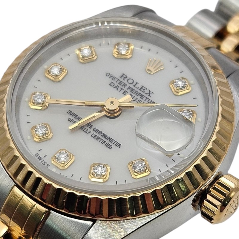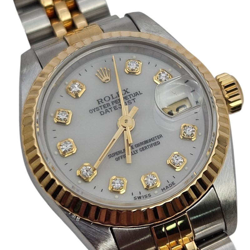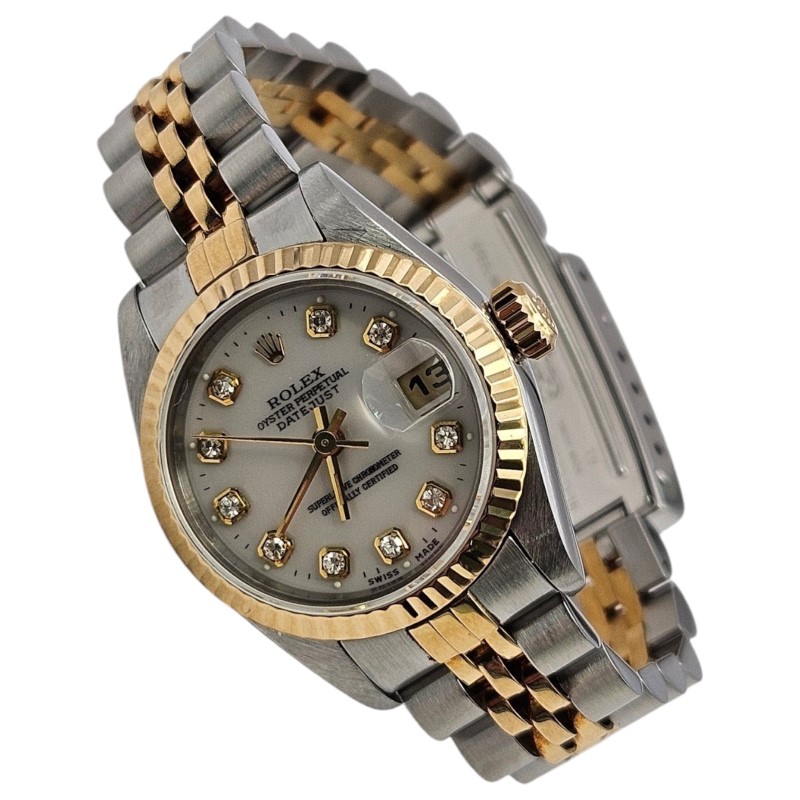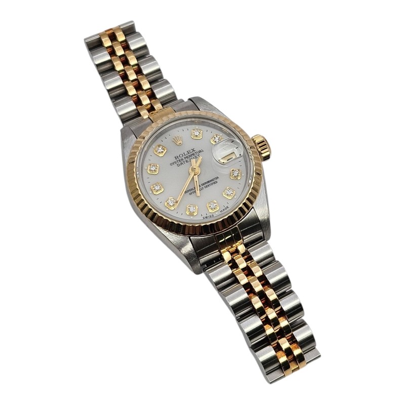 This exquisite ROLEX 69173 Dia Dial & Gold Bezel (1994) watch is a stunning example of timeless elegance. The two-tone stainless steel band complements the white diamond dial, creating a sophisticated and versatile look. The sapphire crystal face ensures durability and clarity, while the round shape provides a classic aesthetic.