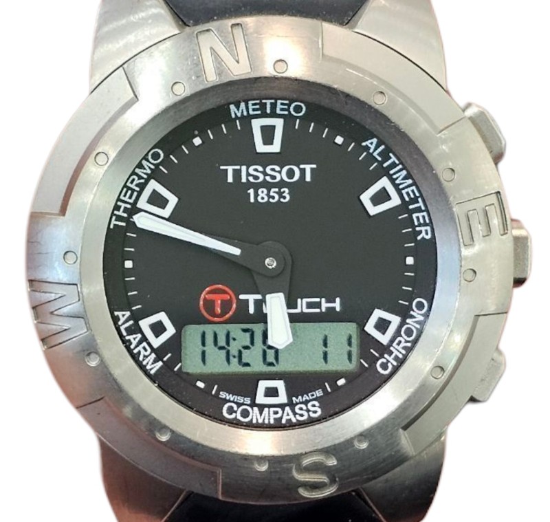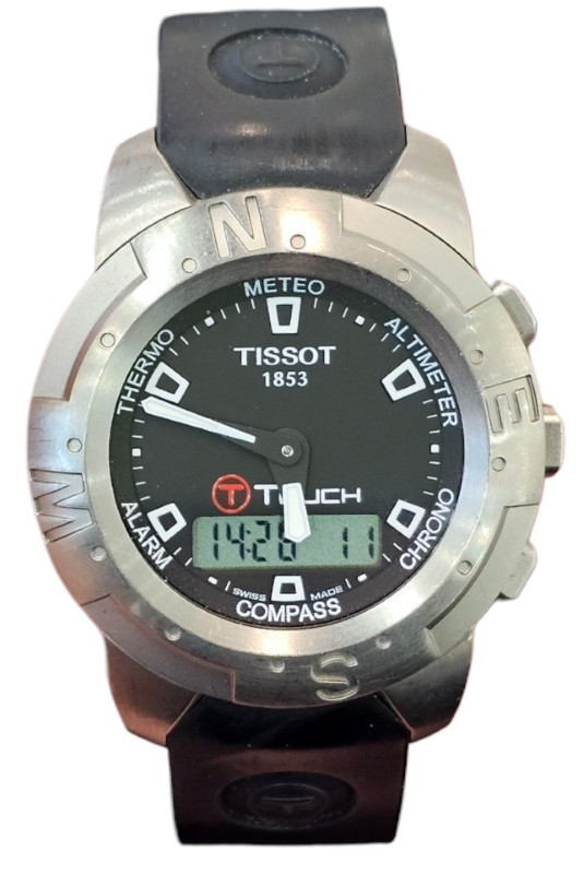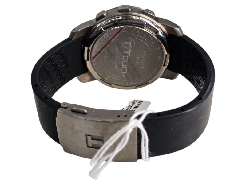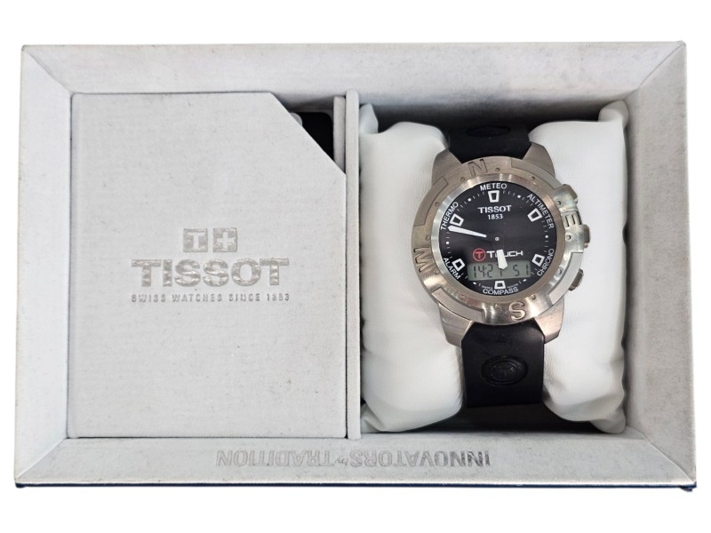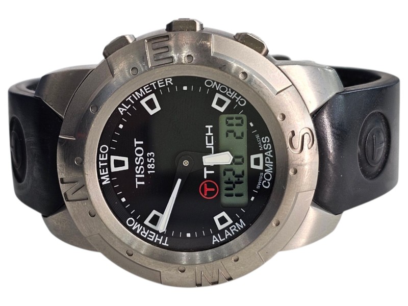This TISSOT T-touch T33.7.589.51 watch features a classic circular face with a black metal finish. The black plastic band provides a comfortable and durable wear. Crafted with precision, this timepiece is a reliable and stylish accessory for the modern gentleman. With its original box included, this pre-owned watch is in excellent condition and ready to accompany you on your daily adventures.