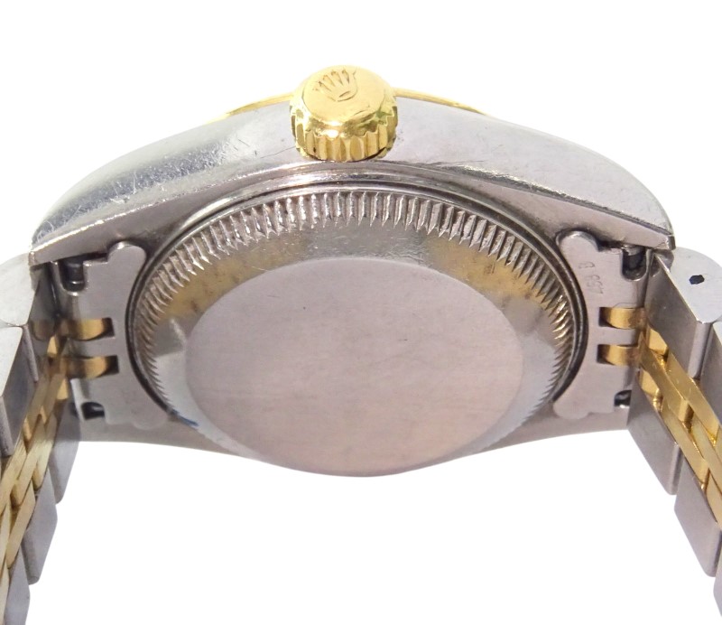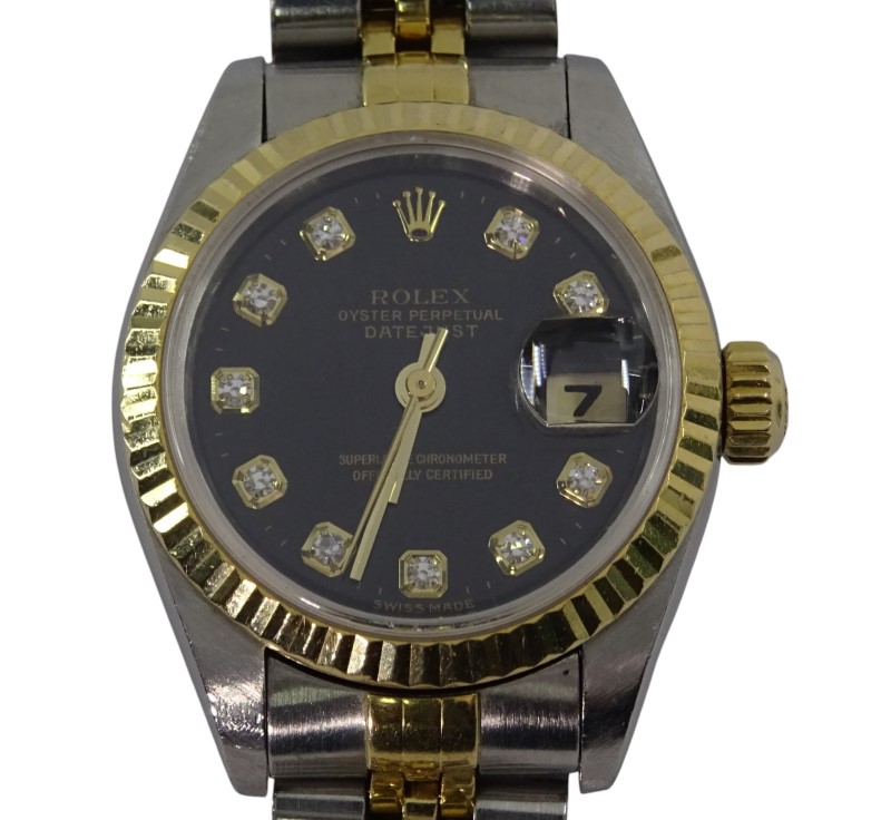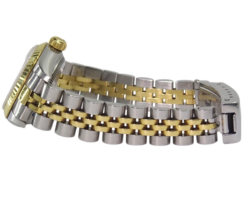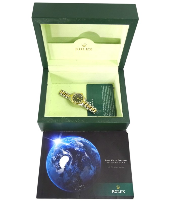 The ROLEX Datejust 69173 (1997) is a stylish ladies' watch with a classic design. Featuring a silver metal band and a black metal face in a circular shape, this timepiece exudes sophistication. The watch comes complete with the original case, warranty card, and booklet, ensuring its authenticity and quality. This timeless ROLEX model is a perfect accessory for any occasion, effortlessly blending modern elegance with the renowned craftsmanship of the iconic Swiss brand.