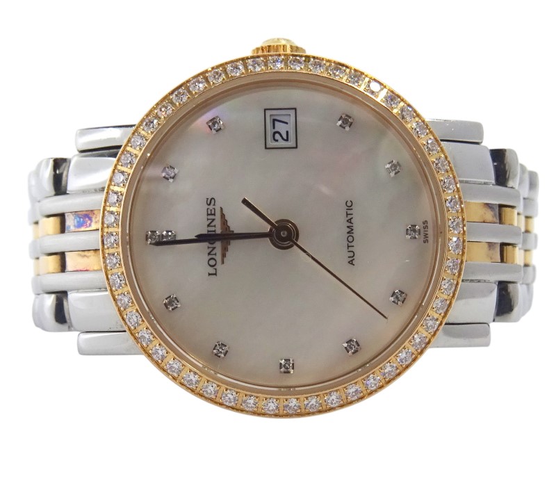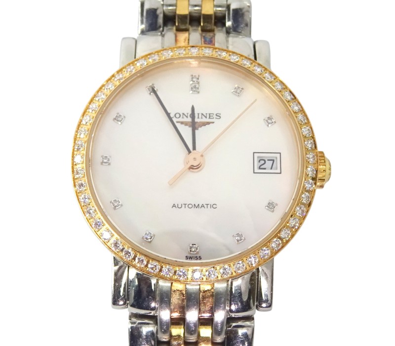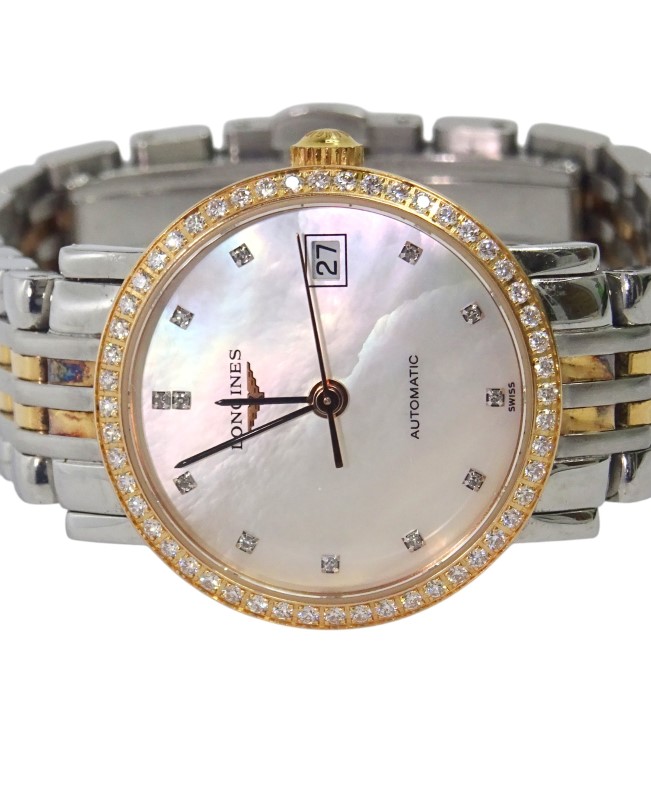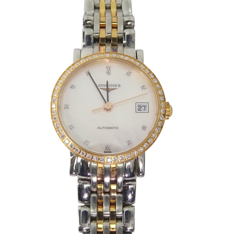 Introducing the LONGINES ELEGANT COLLECTION 25.5mm L.259.2, a stunning ladies' dress watch that exudes timeless sophistication. Featuring a classic circular mother-of-pearl face and a captivating combination of silver and yellow metal accents, this timepiece is a true testament to the brand's commitment to excellence.