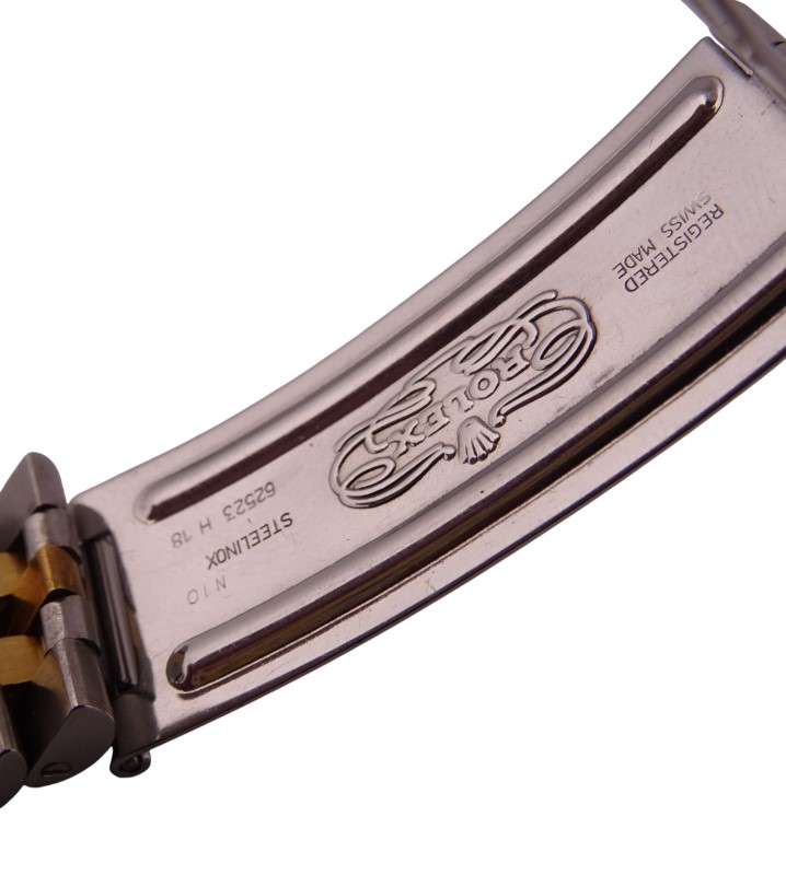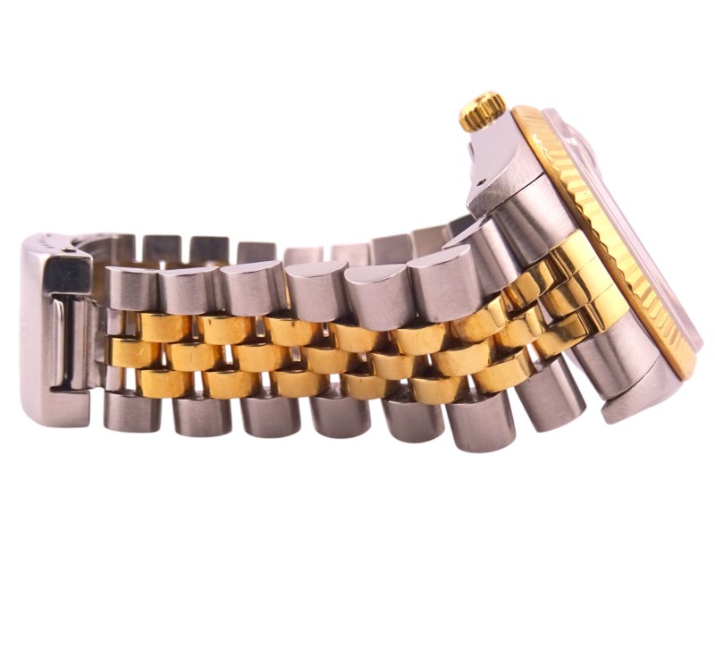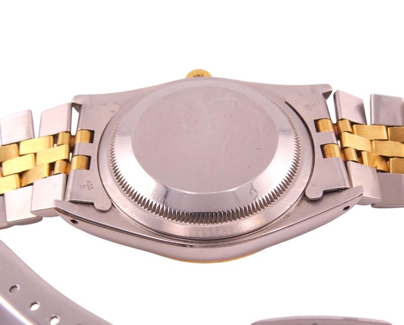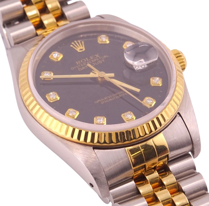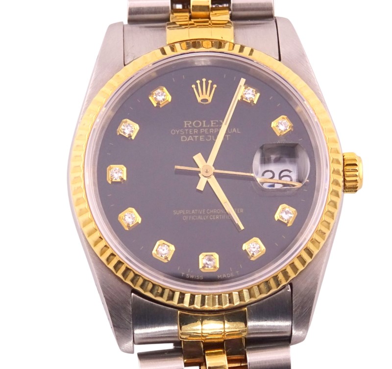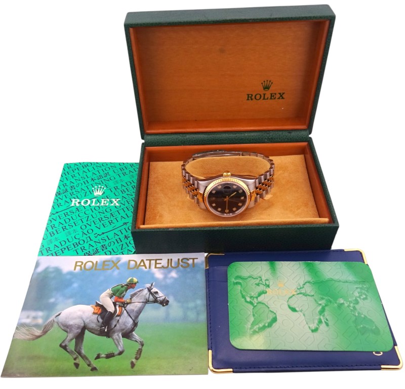 This elegant ROLEX 16233 Datejust watch features a classic circle face with a black diamond dial and a stylish combination of yellow and silver metal on the band. The dot display provides a clean, minimalist look, making this a versatile dress watch suitable for any occasion. The durable metal construction ensures long-lasting wear. Presented in the original box, this pre-owned timepiece is a timeless accessory that will complement any wardrobe.