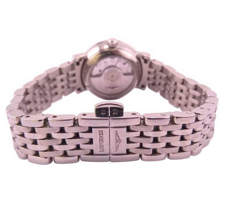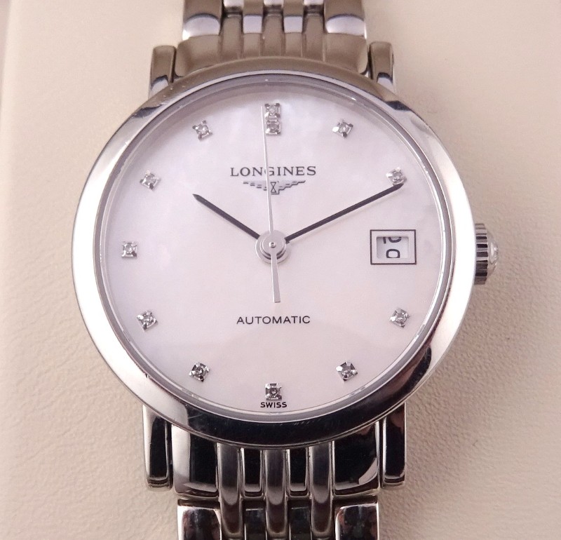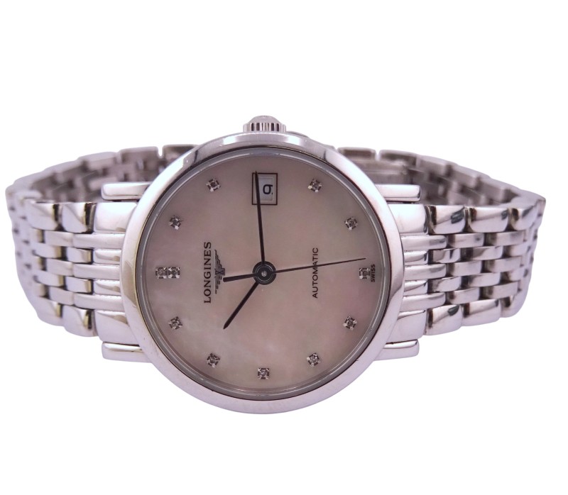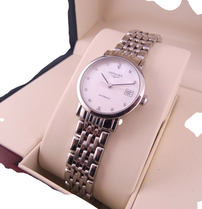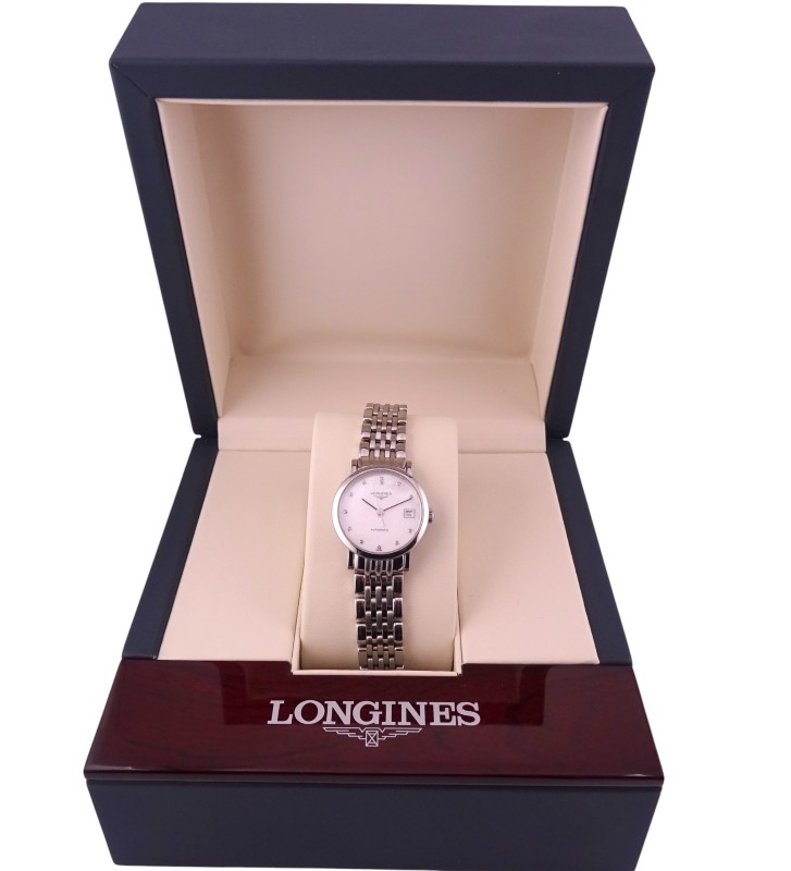 This stunning LONGINES Elegant Collection L4.309.4.87.6 ladies' dress watch is a timeless piece that effortlessly blends elegance and sophistication. The sleek silver metal band complements the captivating mother-of-pearl face, which is adorned with a dazzling diamond display. The circular face shape adds a classic touch, making this watch a versatile accessory for any occasion.