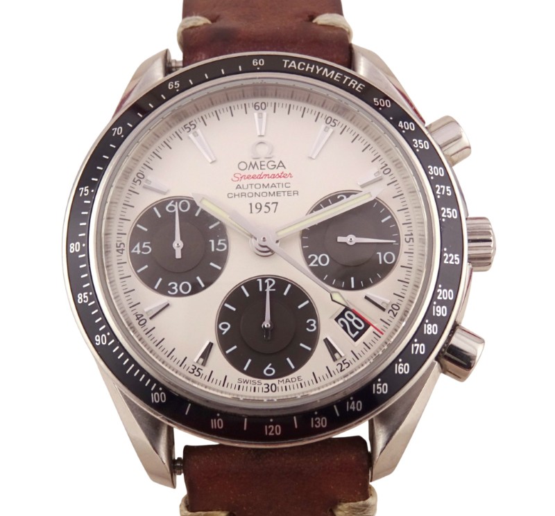 This stunning OMEGA Speedmaster Day / Date 1957 Limited Edition Panda watch is a true classic. Crafted with a timeless brown leather band and a sleek circular white face displaying numbers, this dress watch is the epitome of sophisticated style. The robust stainless steel construction ensures durability, while the iconic Speedmaster design pays homage to OMEGA's rich horological heritage. Whether you're dressing up for a special occasion or seeking a versatile everyday timepiece, this limited edition Speedmaster is a must-have for the discerning gentleman.