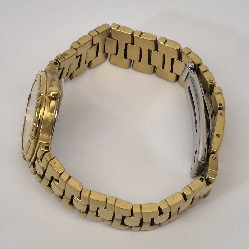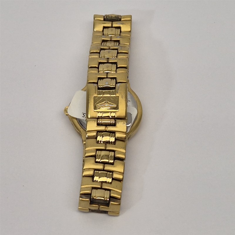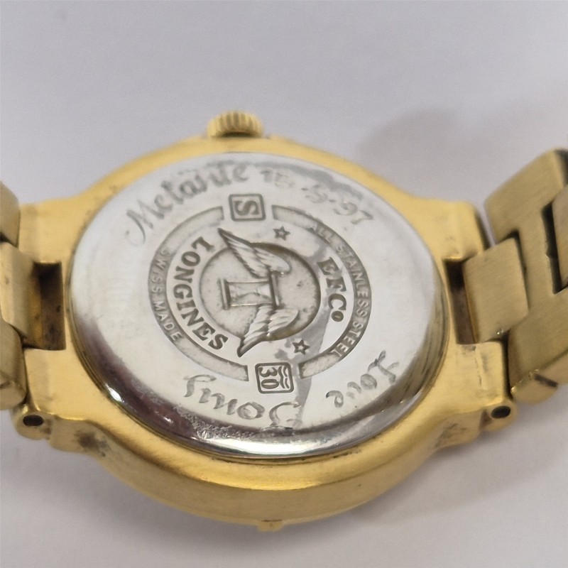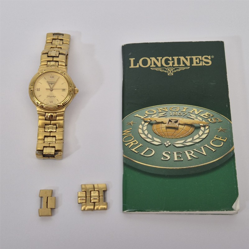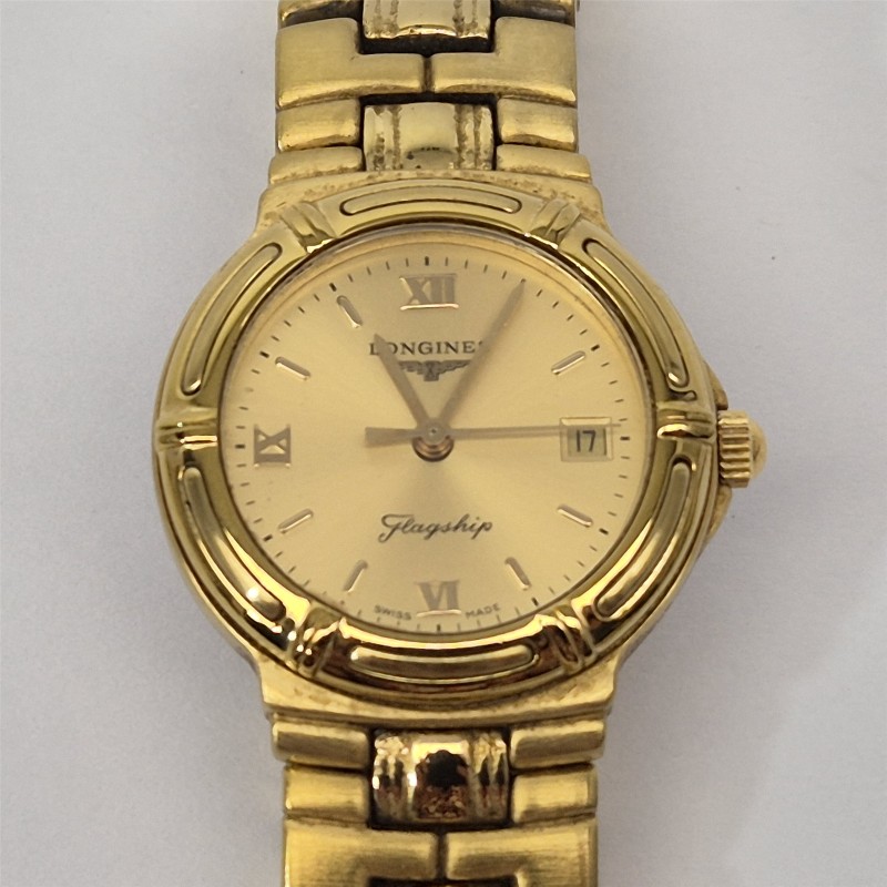 This stunning Longines Flagship ladies' dress watch features a classic circular face with a gold-toned finish and Roman numeral display. The high-quality sapphire glass face is complemented by a sleek, gold-tone metal band that showcases a personalized engraving. Crafted with attention to detail, this timepiece exudes timeless elegance. The included booklet and purchase card, along with the additional 3 links, ensure a comfortable and customizable fit.
