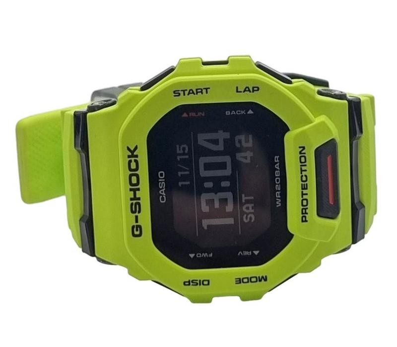 This pre-owned CASIO G-Shock GBD-200 watch features a green plastic band and a durable stopwatch design. The robust construction and iconic G-Shock styling make it a reliable and stylish choice for the modern gentleman. With a range of practical functions and a resilient build, this timepiece is well-suited for active lifestyles.