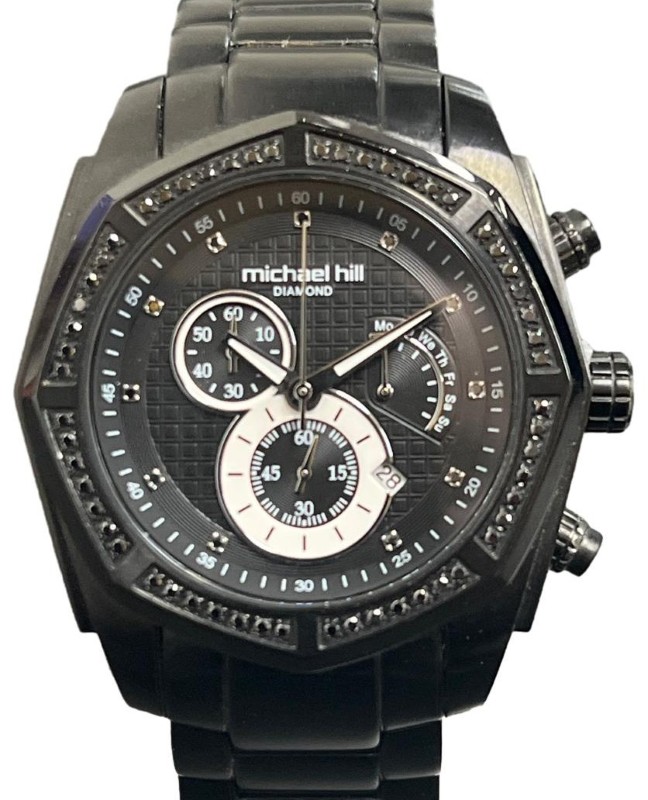 This stylish men's watch from the renowned MICHAEL HILL brand features a classic circular face with a sleek black finish. The durable metal band complements the design, creating a sophisticated and timeless look. The analogue display is protected by a sturdy glass face, ensuring easy readability. With 56 black stones adding a touch of elegance, this timepiece is a versatile accessory suitable for both casual and formal occasions.