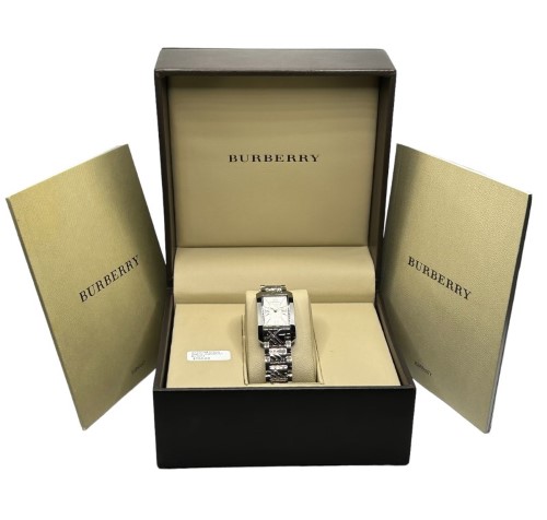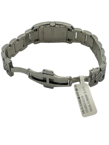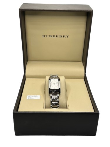 This elegant Burberry BU1091 ladies' watch features a sleek silver-toned metal band and a rectangular glass face with classic Roman numeral markers. The refined design makes it a versatile accessory suitable for both casual and formal occasions. The durable construction ensures long-lasting wear, while the silver-tone finish adds a touch of sophistication. This pre-owned timepiece is a practical and stylish choice for the modern woman.