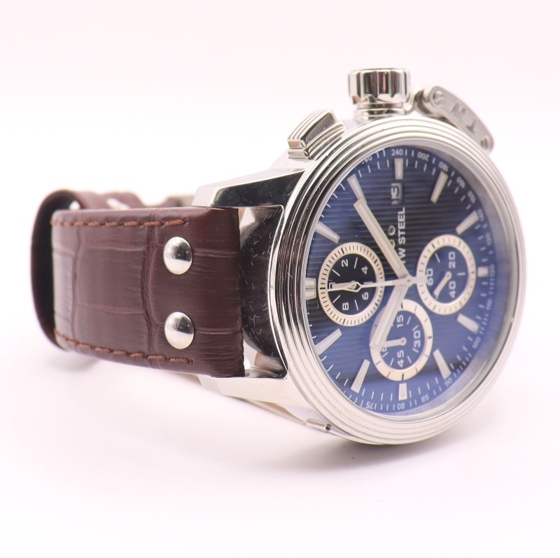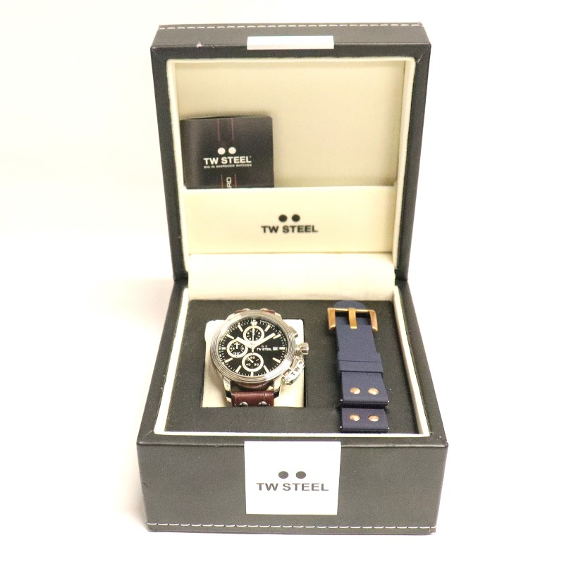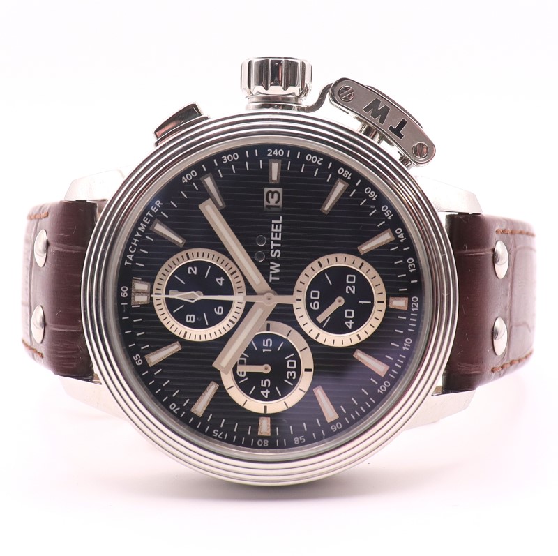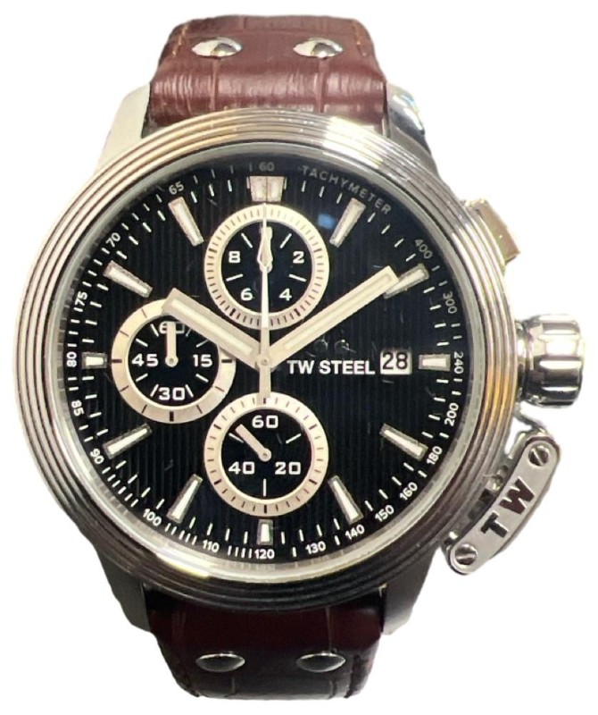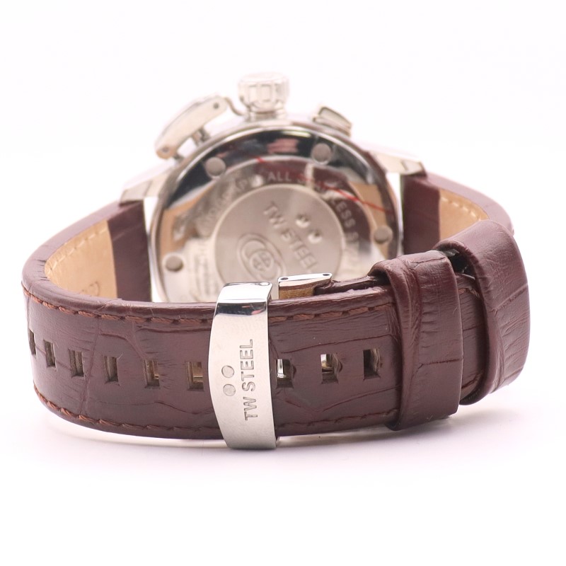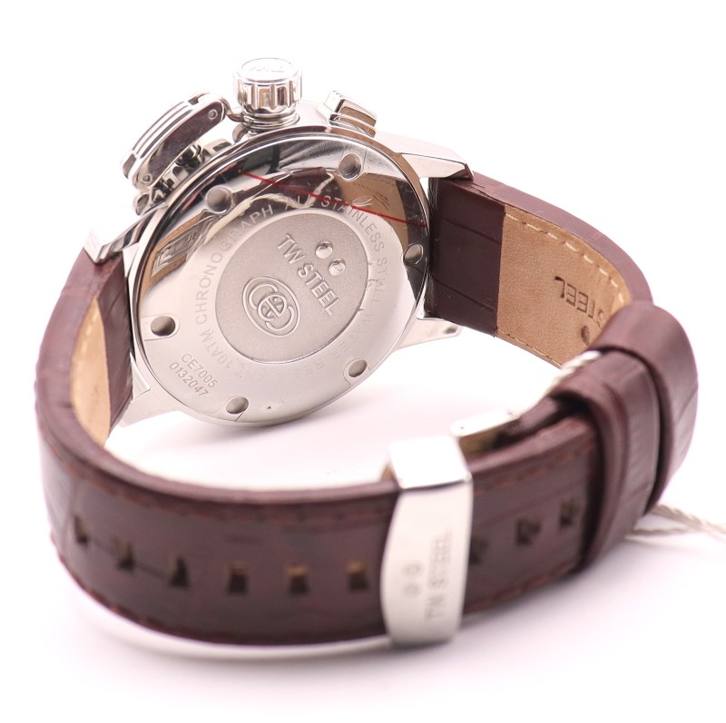 This TW STEEL CE7005 dress watch features a circular face with a brown chronograph display and mineral glass. The brown leather band complements the overall aesthetic. Crafted with a unisex design, this timepiece is a versatile accessory suitable for a variety of occasions.