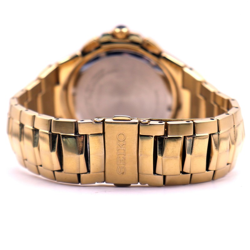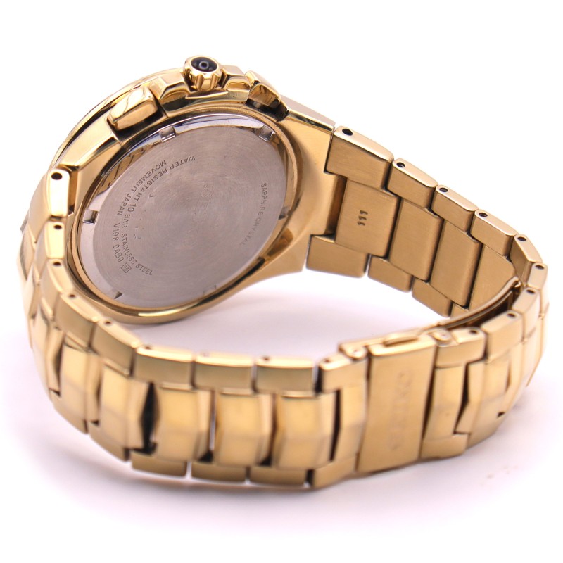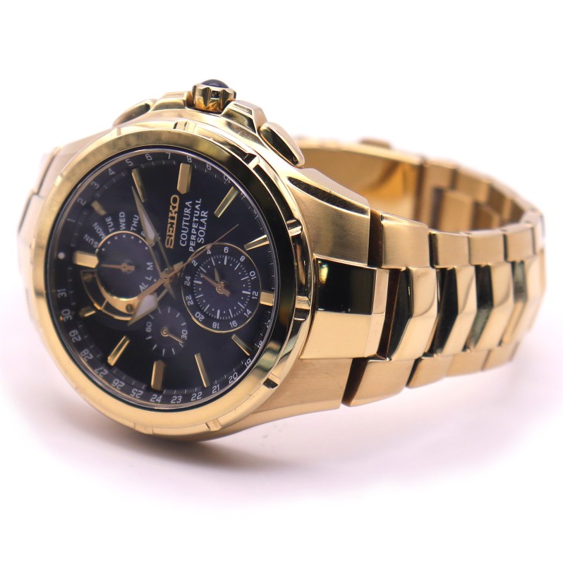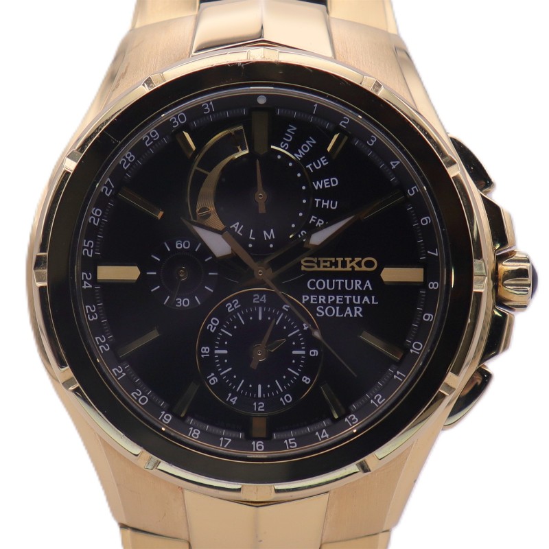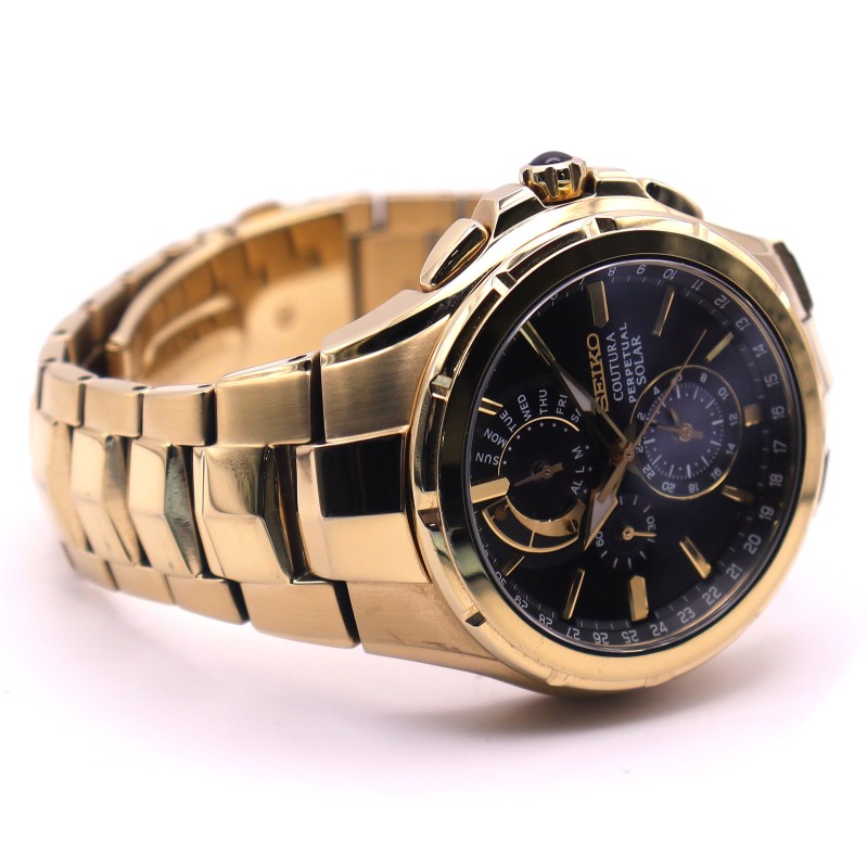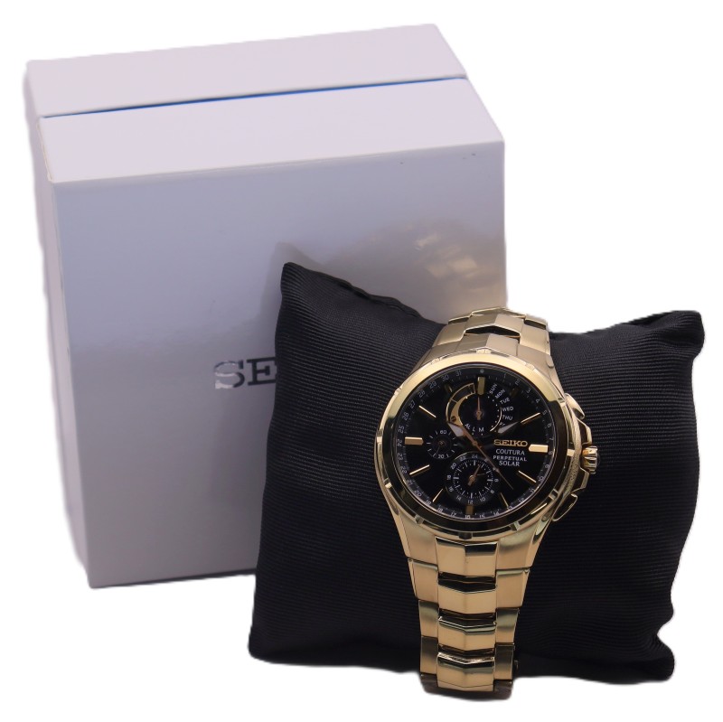 This SEIKO COUTURA PERPETUAL SOLAR watch features a classic circular face with Roman numeral markers set against a sleek black backdrop. The sturdy metal case is complemented by a bold yellow metal band, creating a stylish and durable timepiece. The chronograph function allows for precise time-keeping, while the perpetual solar power source ensures reliable and convenient operation. This versatile men's watch effortlessly transitions from the office to weekend activities, making it a versatile addition to any wardrobe.