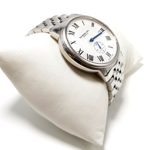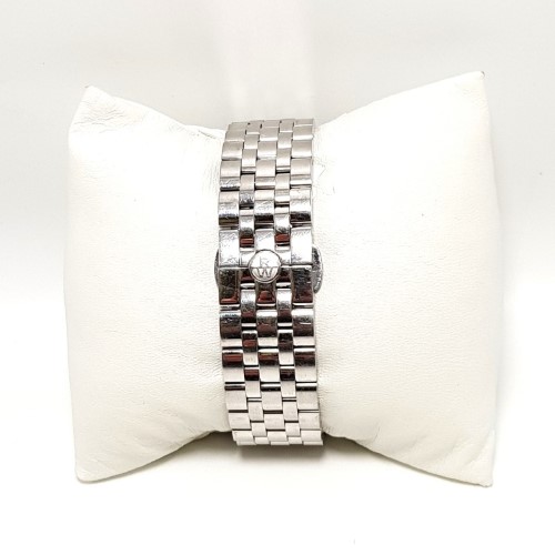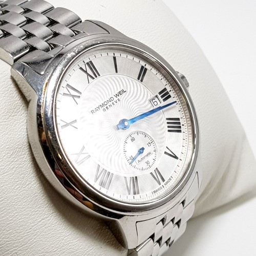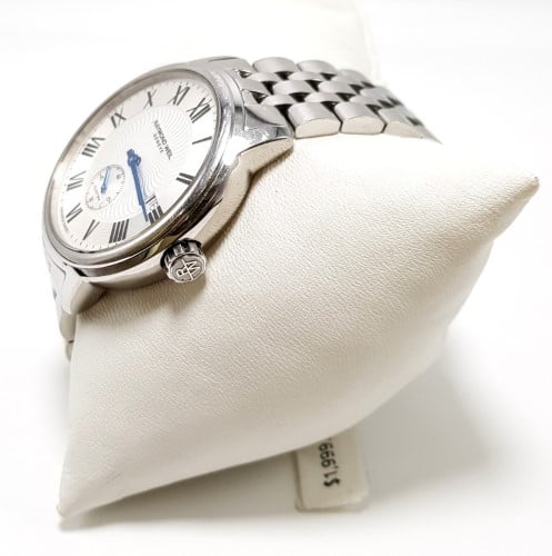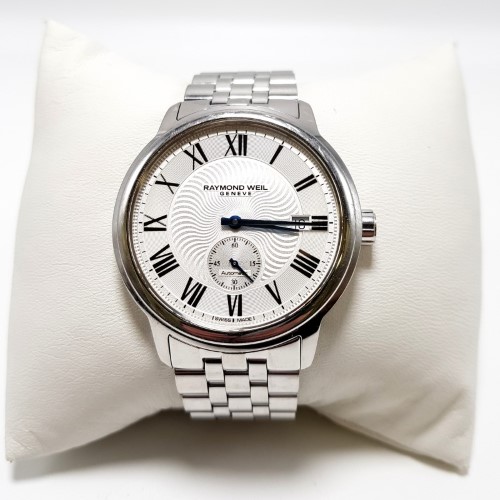 This RAYMOND WEIL 2238 Maestro Automatic watch features a sleek chrome metal band and a classic white face with Roman numerals. The circular face shape and automatic movement make this a sophisticated dress watch suitable for any occasion. The metal construction ensures durability and a polished look.