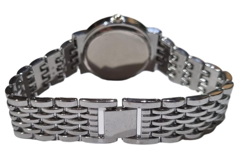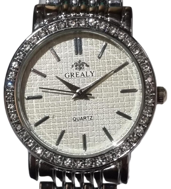 This classic ladies' dress watch from the Grealy brand features a sleek silver metal band and a simple white plastic face with bold printed numbers. The circular design and understated aesthetic make it a versatile accessory that can be dressed up or down to suit any occasion. Whether you're looking for a timeless timepiece for the office or a stylish complement to your evening wear, this second-hand Grealy watch is a practical and fashionable choice.