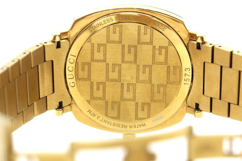 This pre-owned GUCCI 157.3 dress watch features a sleek and sophisticated gold-toned metal band and face. With its unisex design, it's a versatile accessory that can be dressed up or down to suit any occasion. The metal construction ensures durability and a premium feel. Whether you're looking to add a touch of luxury to your everyday style or seeking a timeless piece for special events, this GUCCI watch is a reliable and stylish choice.