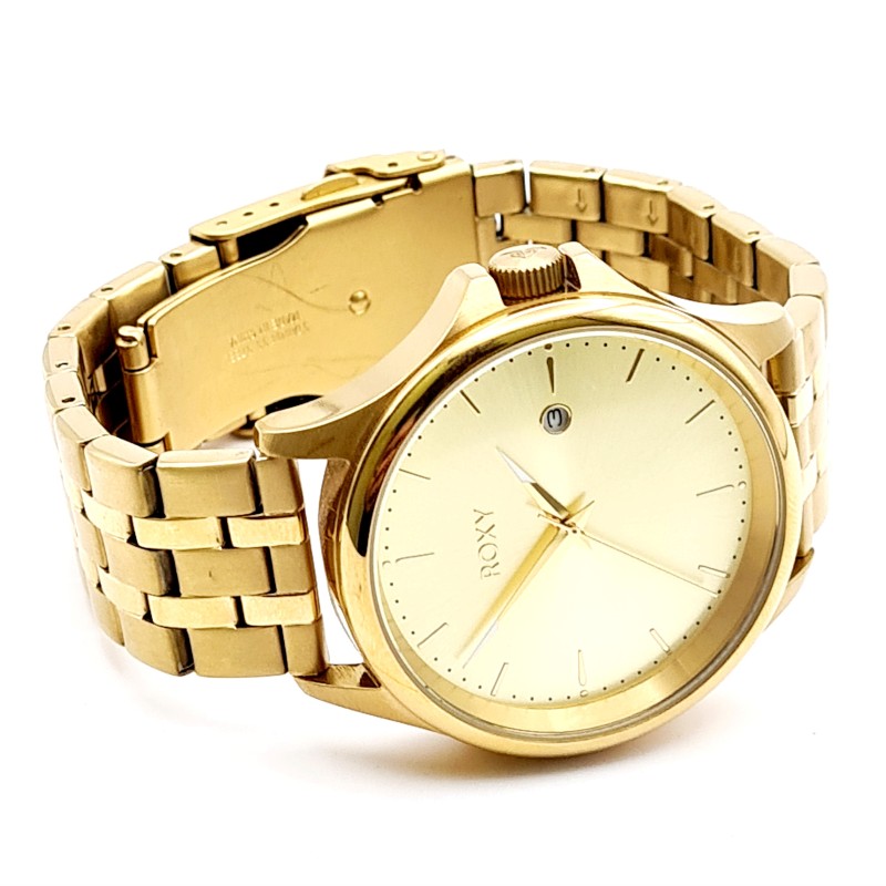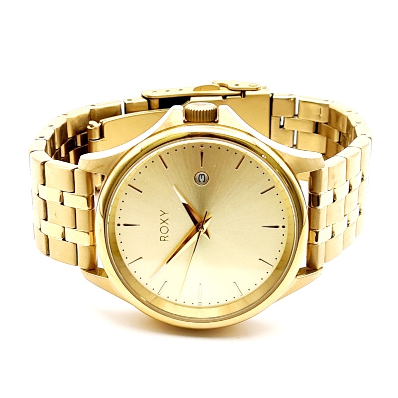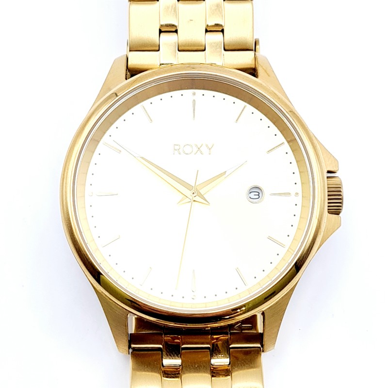 This stunning ROXY watch features a classic circular face in a gleaming gold tone, complemented by a sleek metal band in a matching gold hue. Crafted with a unisex design, this timepiece effortlessly transitions from casual to dressy occasions. The watch is in as-new condition and will comfortably fit wrists up to 21cm, though no spare links are included.