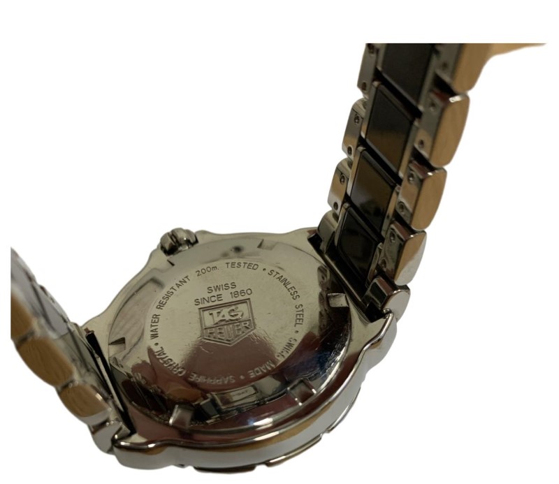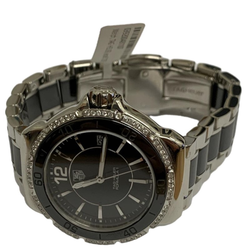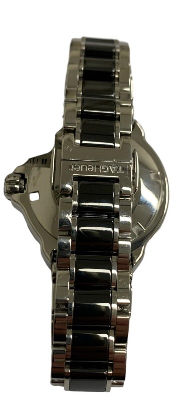 This stunning TAG HEUER Formula 1 Lady Steel Ceramic 37 mm watch exudes elegance and sophistication. The sleek black stainless steel and ceramic polished band complements the striking black face, which features luminous hands and a bezel adorned with 60 sparkling diamonds totaling 0.34 carats. The durable sapphire crystal face ensures long-lasting clarity and protection. Designed for the modern, fashionable woman, this quartz movement timepiece is the perfect accessory for any occasion.