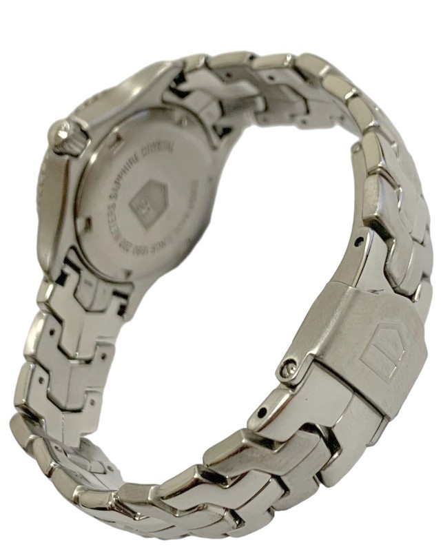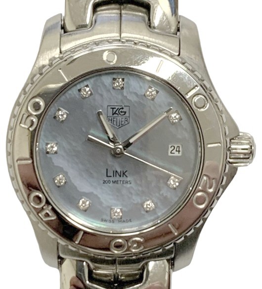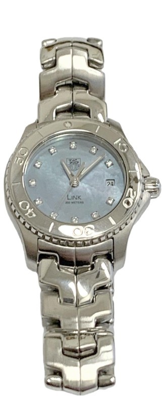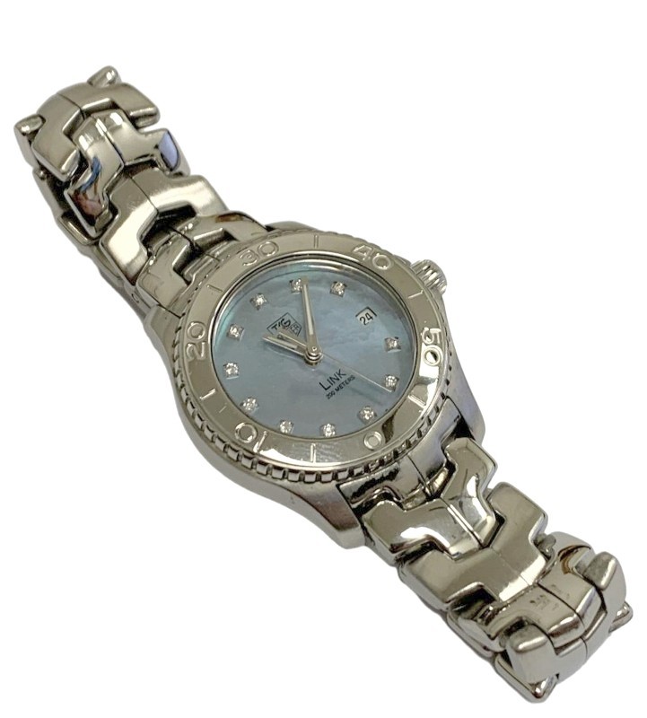 This exquisite secondhand TAG HEUER Link Ladies Diamond Watch is a stunning accessory that effortlessly blends elegance and sophistication. Featuring a sleek silver stainless steel band, this timepiece boasts an alluring mother-of-pearl blue dial adorned with 11 full-cut diamonds, totaling 0.081 carats. The diamond-encrusted face adds a touch of glamour, making this watch a true statement piece.