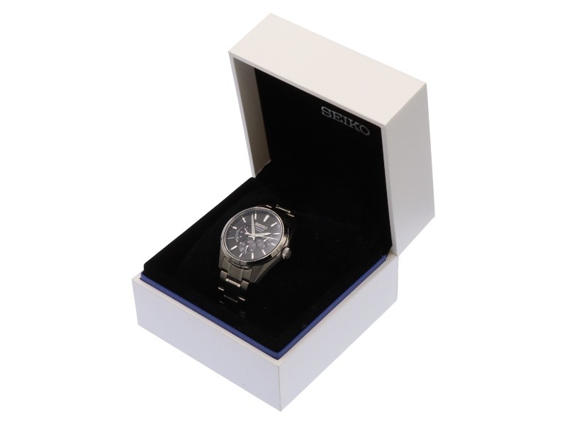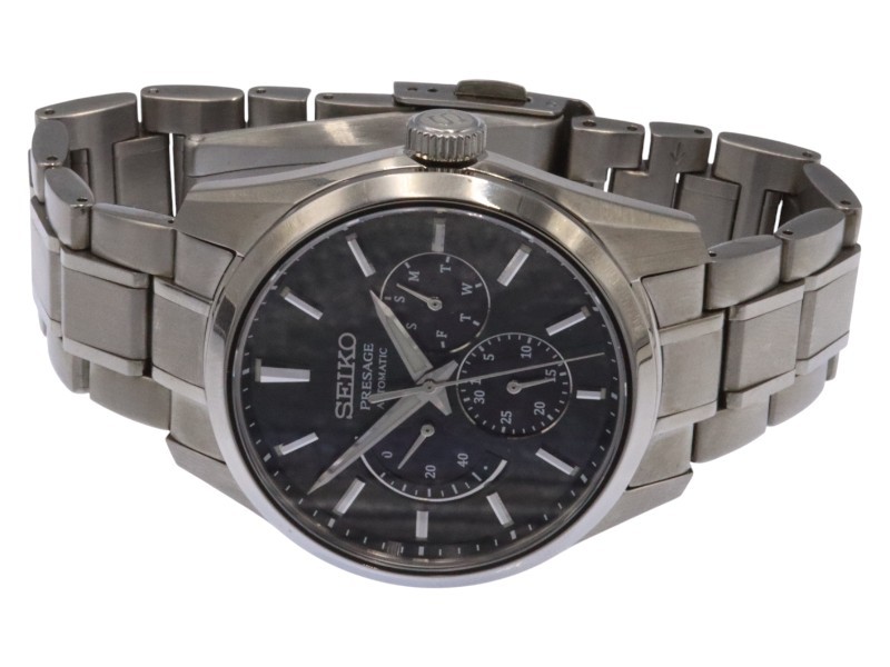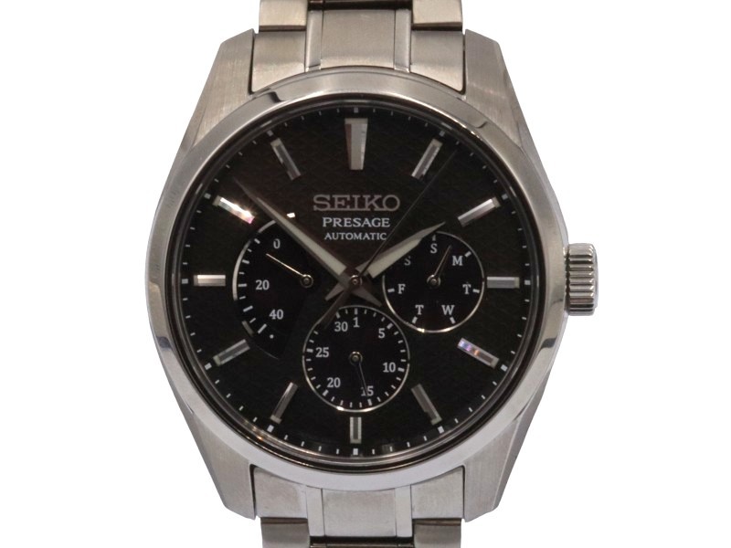 This classic SEIKO Presage Sharp Edged Kurotobi - SPB307 dress watch features a sleek silver metal band and a bold black plastic face with Roman numerals. The circular design and metal construction give this timepiece a sophisticated, timeless look that complements any outfit. Whether dressing up for a formal event or adding a touch of refinement to your casual wear, this SEIKO watch is a versatile and stylish accessory.