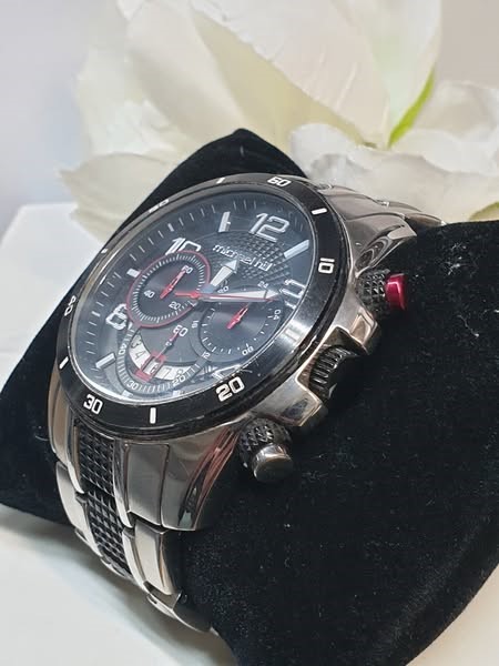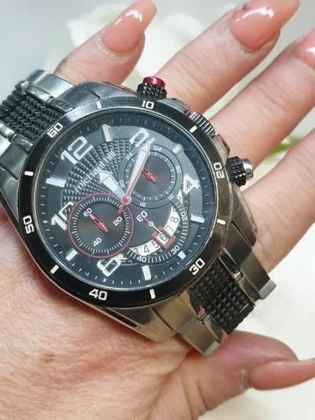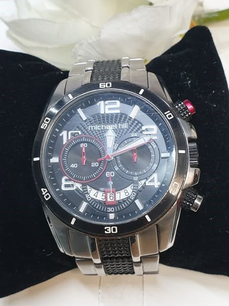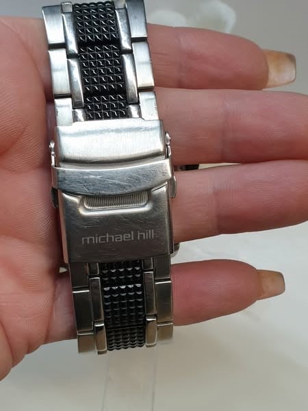 This pre-owned MICHAEL HILL watch features a sleek silver metal band and a circular black metal face with a classic numeric display. The engraved model number 9375 adds a touch of personalization. As a chronograph timepiece, it offers precise timekeeping functionality. With a weight of 181.2 grams, this men's watch has a substantial yet comfortable feel on the wrist.