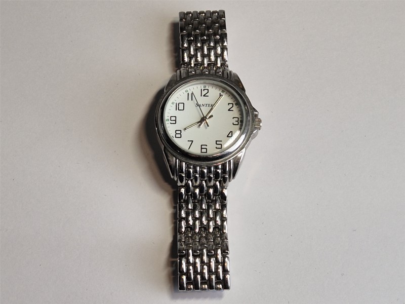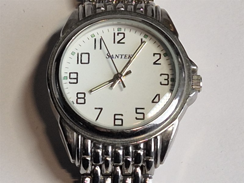 This SANTEK men's wrist watch features a sleek, circular face with a white display showcasing the numbers. The metal face and silver metal band give the watch a sophisticated, timeless look. The engraved SANTEK branding on the face adds a touch of personalisation. This classic timepiece is a versatile accessory that can be dressed up or down to suit any occasion.