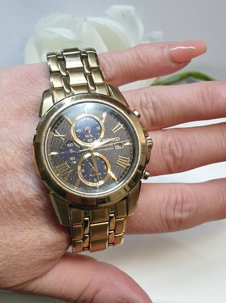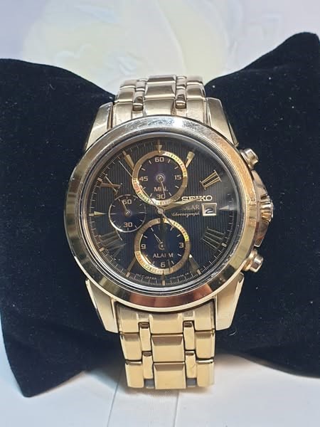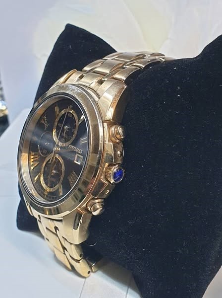 This exquisite SEIKO dress watch boasts a timeless circular face with a sophisticated black and gold colour scheme. The sapphire crystal face features bold Roman numerals, ensuring exceptional clarity and durability. Crafted with a sleek metal band in a stylish gold hue, this timepiece exudes an air of refined elegance that complements any attire.