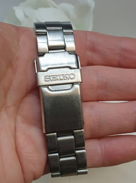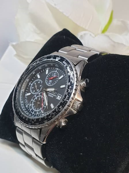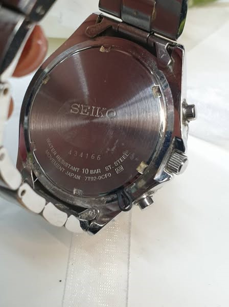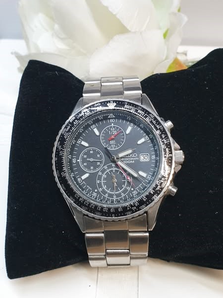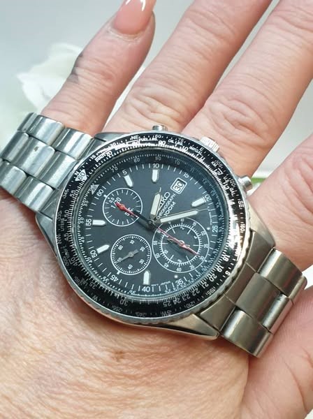This pre-owned Seiko Chronograph watch features a sleek silver metal band and a striking black face with a CHRONO display. The durable sapphire glass face ensures long-lasting clarity and protection. With a round shape and a water resistance of 100m, this versatile men's wrist watch is suitable for both casual and formal occasions. Please note that a battery may be required.