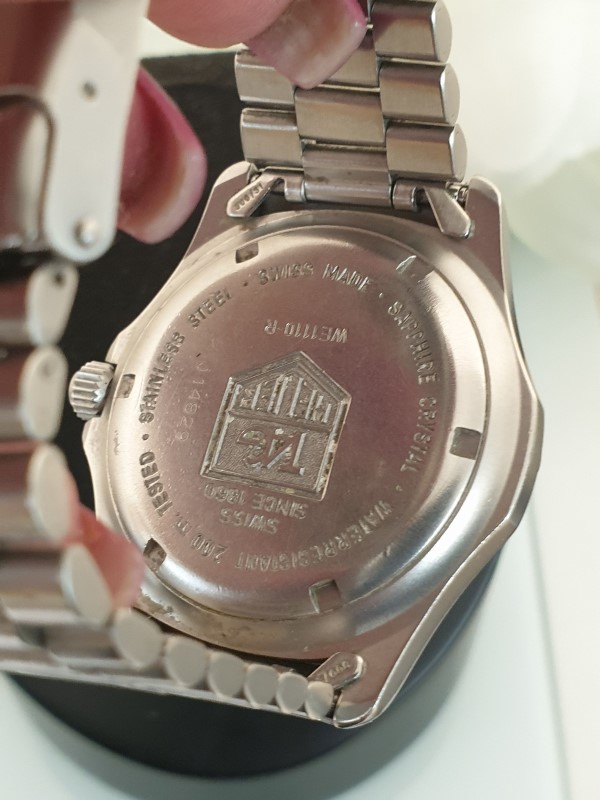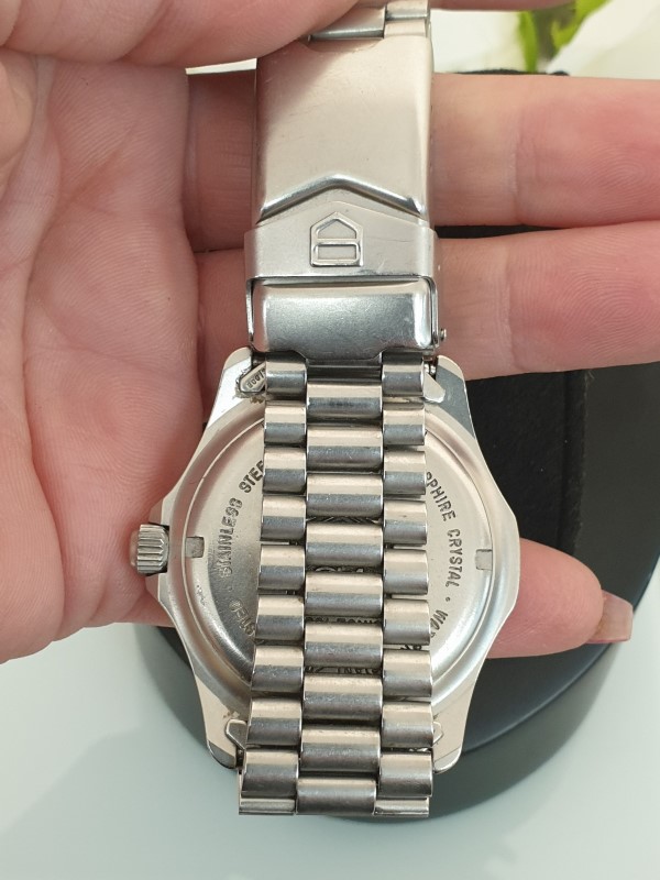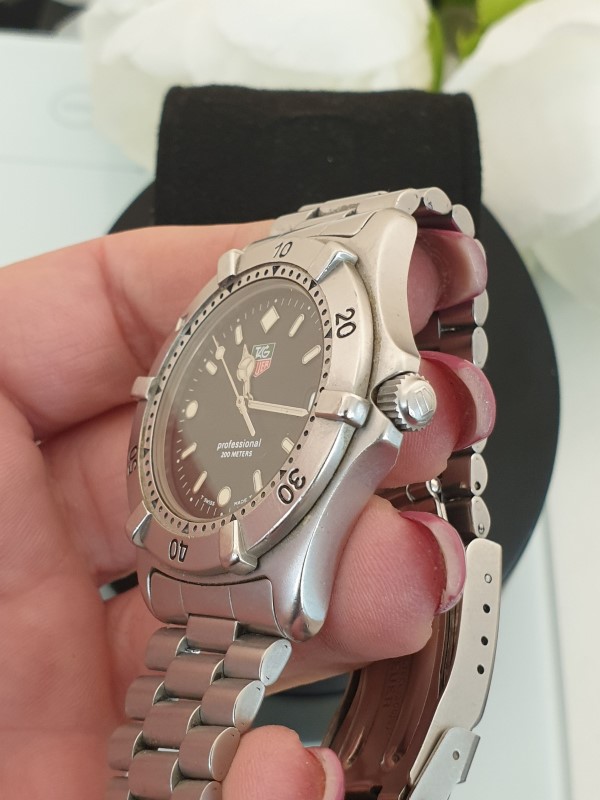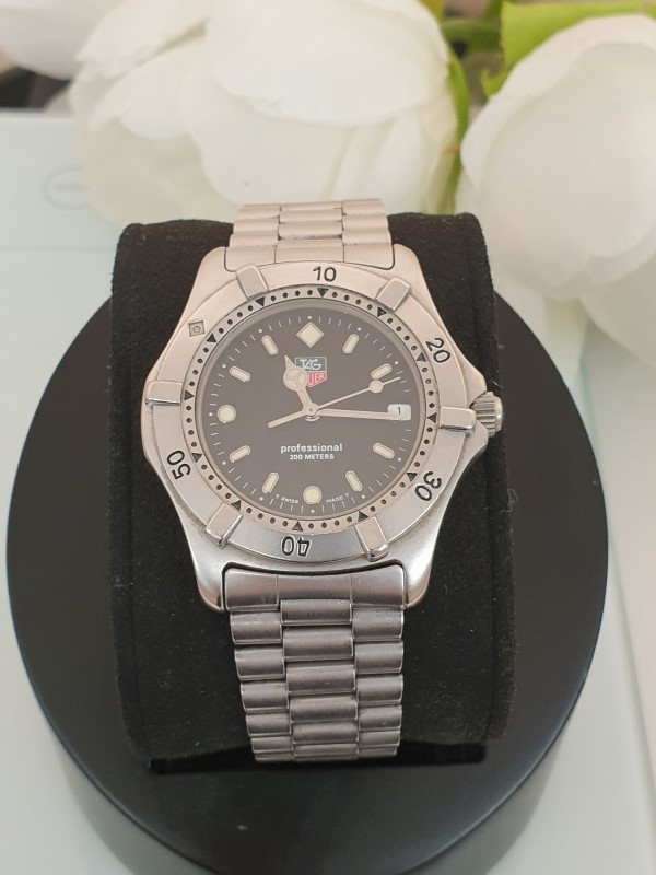 This pre-owned TAG HEUER PROFESSIONAL 200M watch features a sleek silver metal band and a striking black face with a STROKES display. The face is crafted from durable SAPPHIRE GLASS in a classic circular shape, making it a stylish and practical choice for the modern gentleman. While the latch may need some attention, this well-made timepiece is ready to be your reliable everyday companion. With a weight of 95.47 grams, it offers a substantial and comfortable wear.