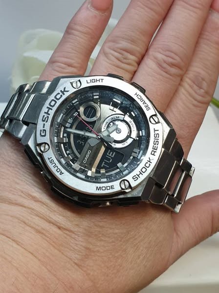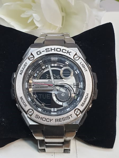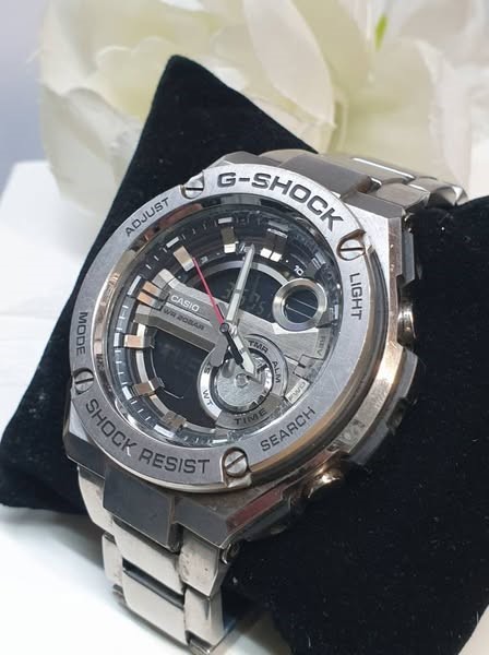 This sleek and stylish G-SHOCK WORKING GST-210D watch features a silver metal band and a black glass face with a digital display. The circular face design gives it a classic, dress watch aesthetic that can be dressed up or down to suit any occasion. With a weight of 181.75 grams, this timepiece has a substantial and durable feel on the wrist.