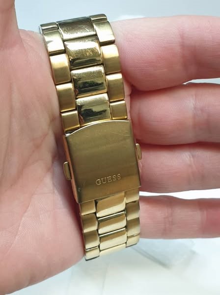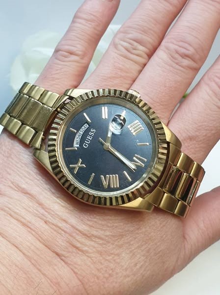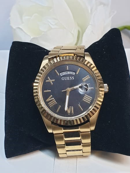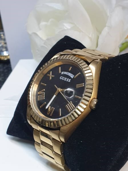 This classic GUESS men's watch features a sleek and sophisticated design that is perfect for any occasion. The gold-toned metal band complements the black face, which displays the time with elegant Roman numerals. The circular face is crafted from durable glass, ensuring a clear and legible display. With a weight of 126.98 grams, this timepiece offers a substantial and comfortable feel on the wrist.
