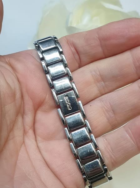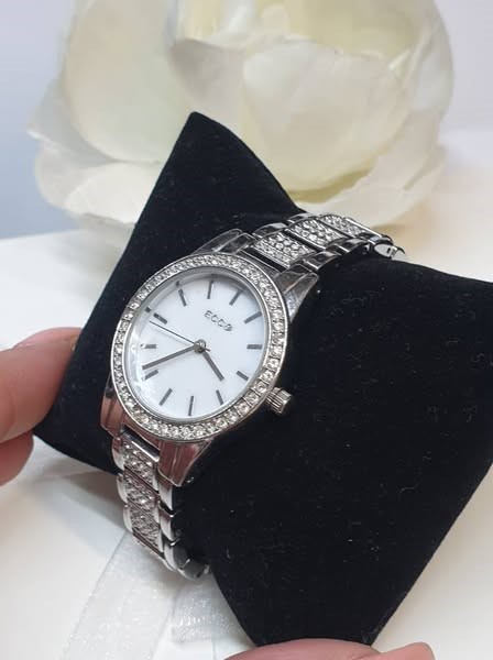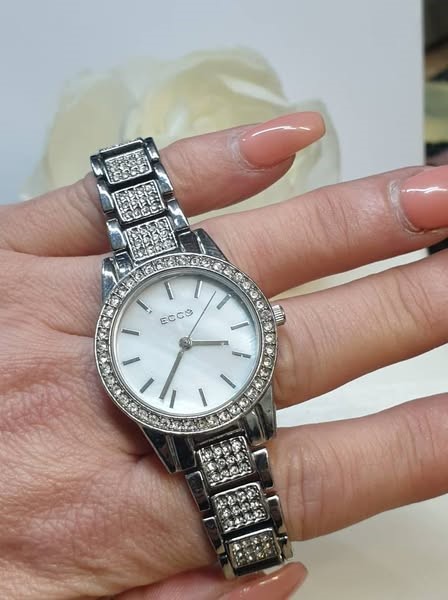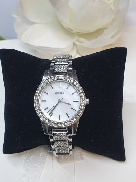 This elegant ECCO WORKING ladies' dress watch features a sleek chrome metal band and a stunning pearl-colored face with a classic circular design. The minimalist lines on the face create a sophisticated and timeless look, perfect for any occasion. Crafted with attention to detail, this pre-owned timepiece is a reliable and stylish accessory that will complement your wardrobe.