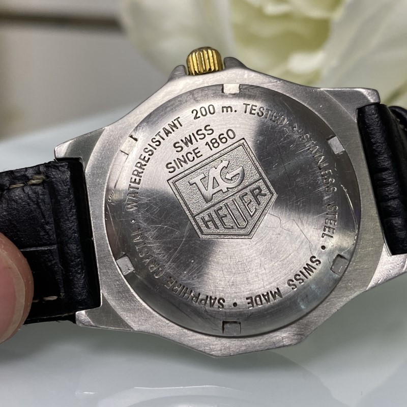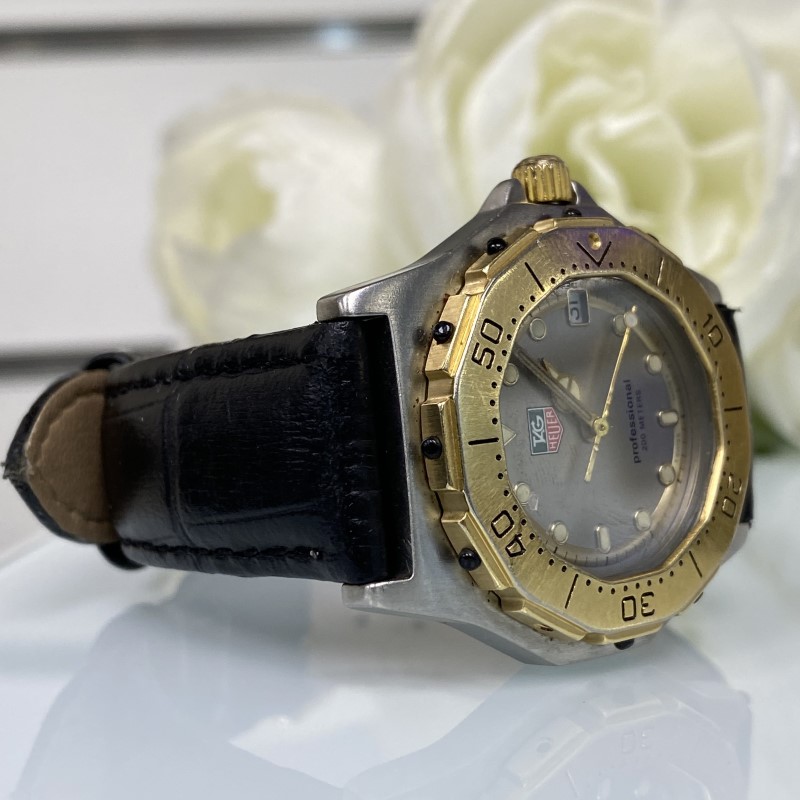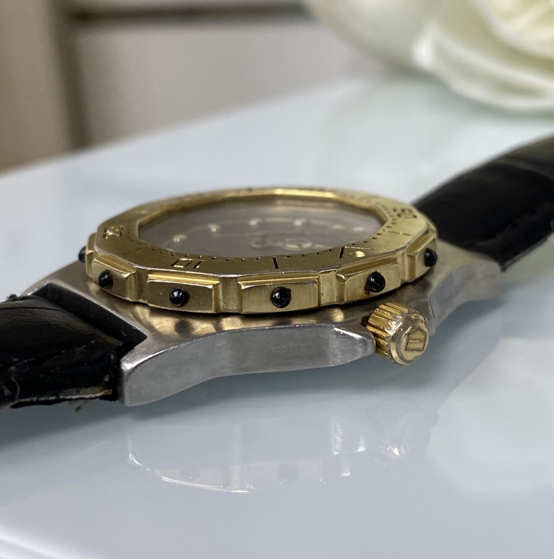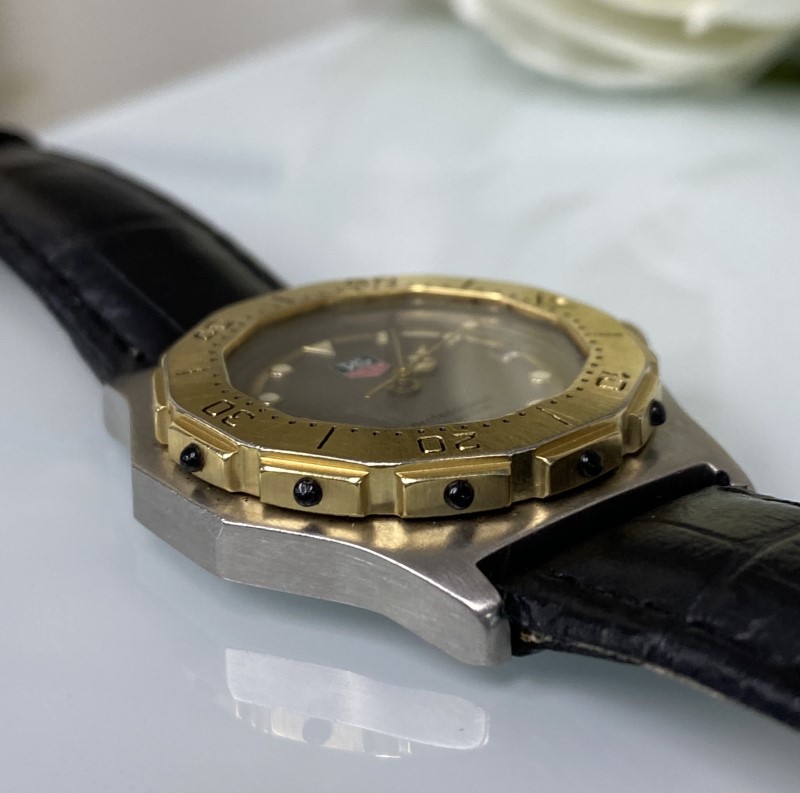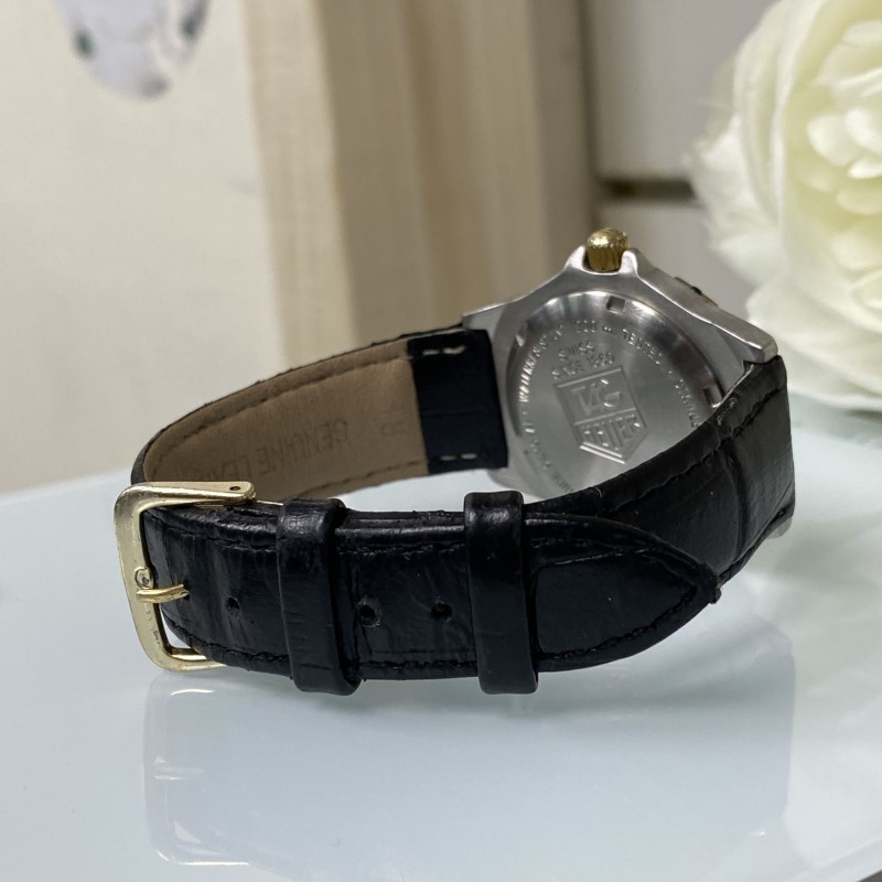 This elegant TAG HEUER watch features a sleek black leather band and a stunning gold-toned face with a stylish dot display. The high-quality sapphire glass crystal ensures durability and clarity, while the round shape offers a timeless, sophisticated look suitable for any occasion. Crafted with precision, this unisex dress watch is a reliable and versatile accessory.