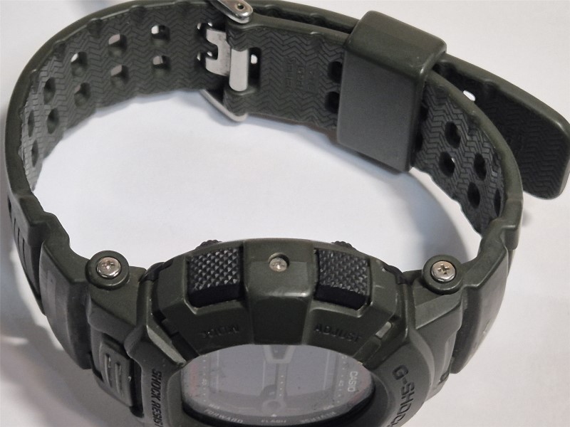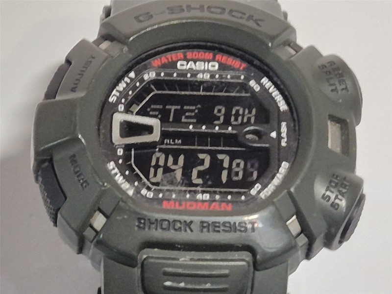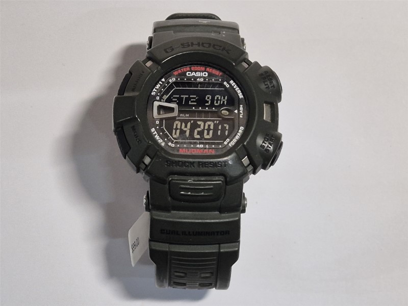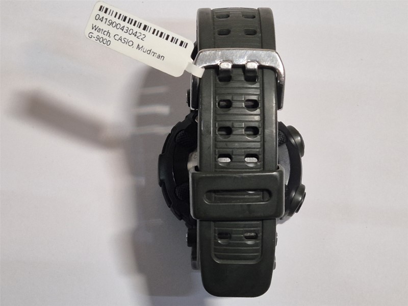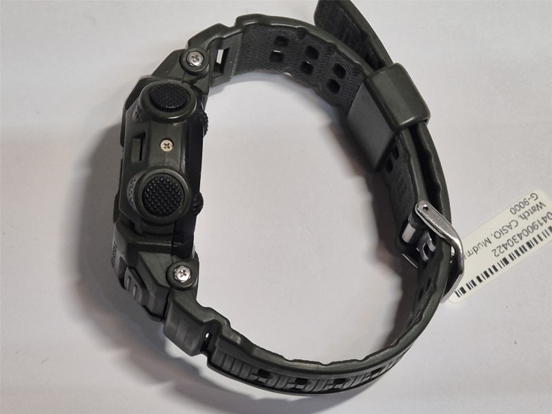 This CASIO Mudman G-9000 sports watch is a rugged and reliable timepiece designed for the active lifestyle. The green nylon band and beige plastic face provide a classic and versatile look, while the digital display ensures easy readability. With a circular face shape and weighing just 57.7 grams, this watch is comfortable and practical for everyday wear.