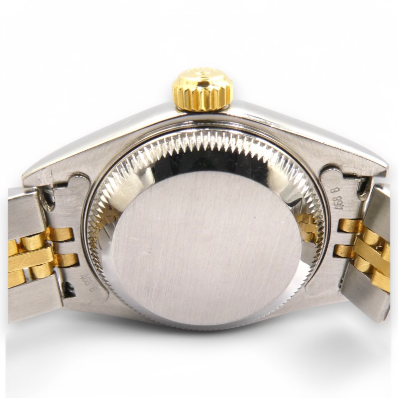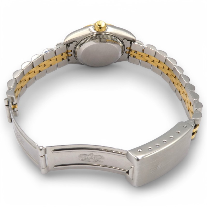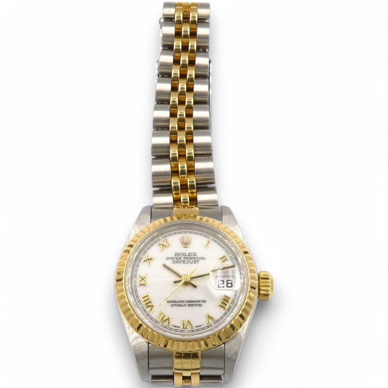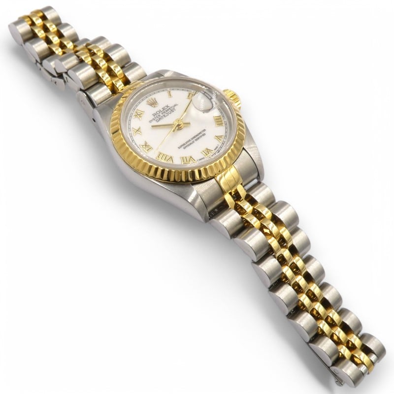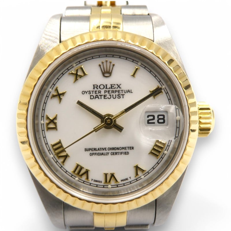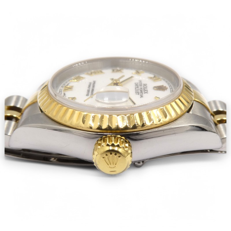This elegant Rolex Oyster Perpetual Datejust Automatic watch features a captivating combination of 18k yellow gold and stainless steel. The 26mm classic white dial, adorned with Roman numerals, is protected by a durable sapphire crystal face. The 13mm band, crafted from a blend of gold and silver, adds a touch of timeless sophistication. Presented in very good condition, this ladies' dress watch is a sophisticated accessory that will seamlessly complement any ensemble.